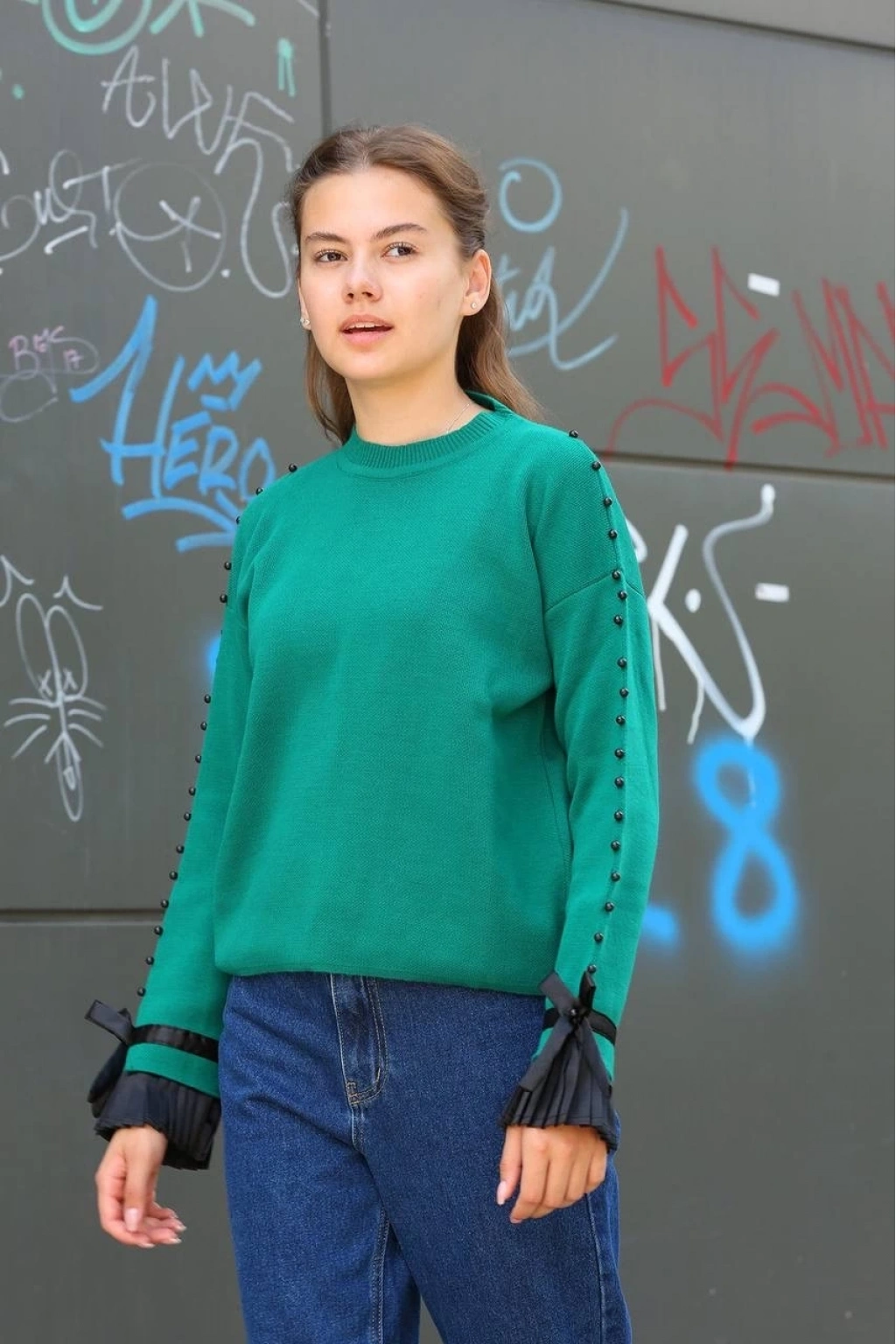 Şıklığı ve rahatlığı bir arada sunan Petrol Yeşili Boncuklu Detaylı Kazak, gardırobunuzun vazgeçilmez parçası olmaya aday!