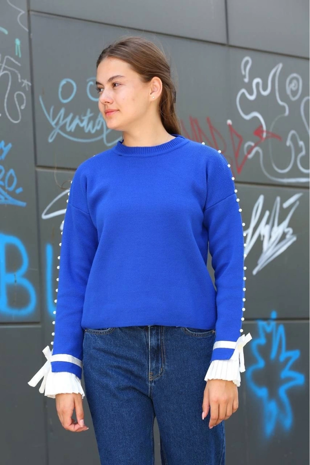 Boncuklu detaylarıyla şıklığı ön plana çıkaran saks mavisi kazak, gardırobunuzun favori parçalarından biri olmaya aday!