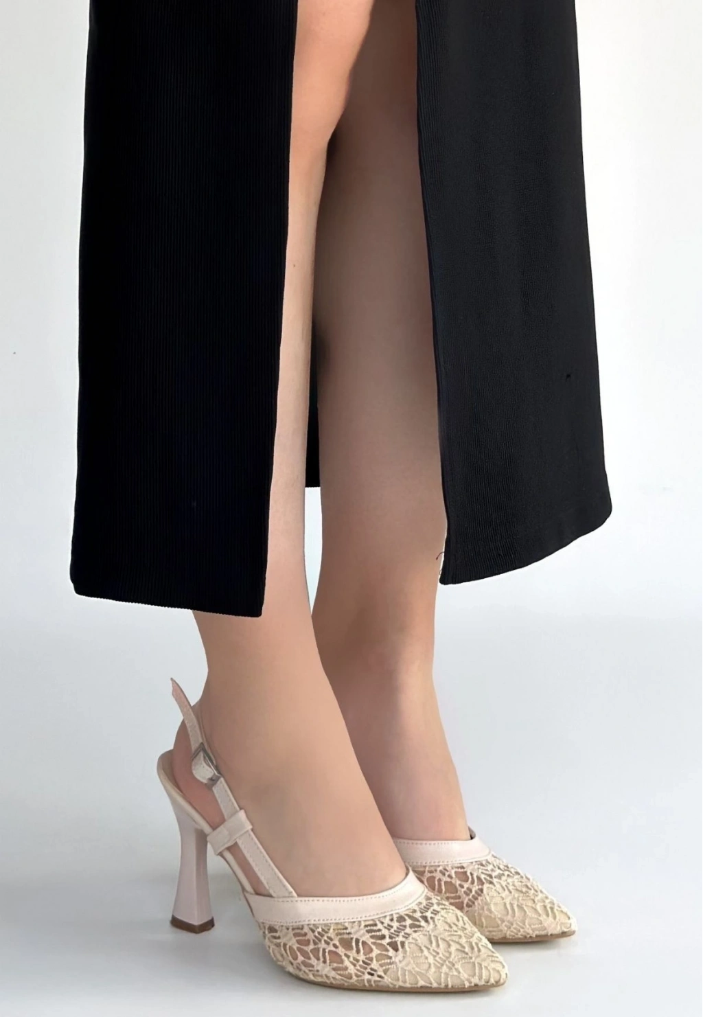 Ceta Bej Cilt Tül Detaylı Topuklu Ayakkabı
