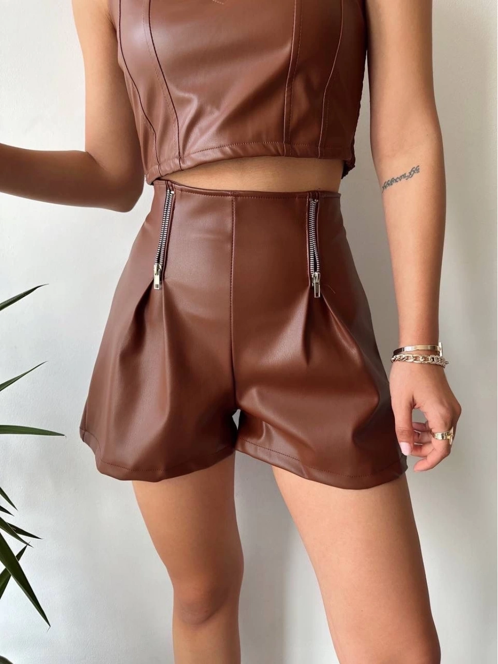Çift fermuar detaylarıyla şıklığı ve rahatlığı bir arada sunan Kahve Deri Şort ile tarzınızı yansıtın.