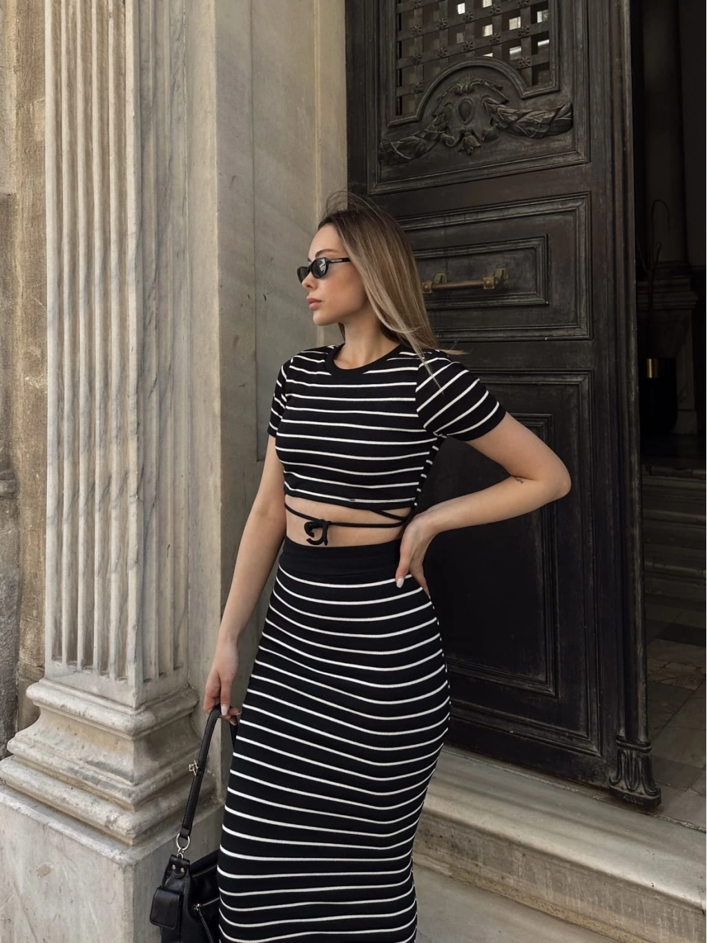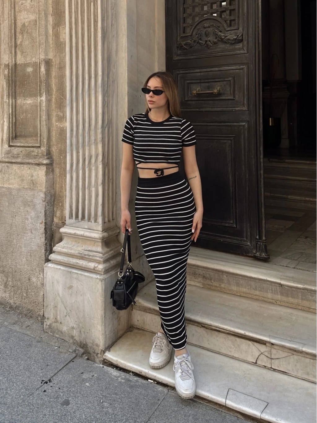 Bu siyah çizgili etekli takım, şıklık ve rahatlığı bir arada sunuyor. Hem günlük kullanıma hem de özel davetlere uygun olan bu takım, gardırobunuzun vazgeçilmezi olmaya aday.