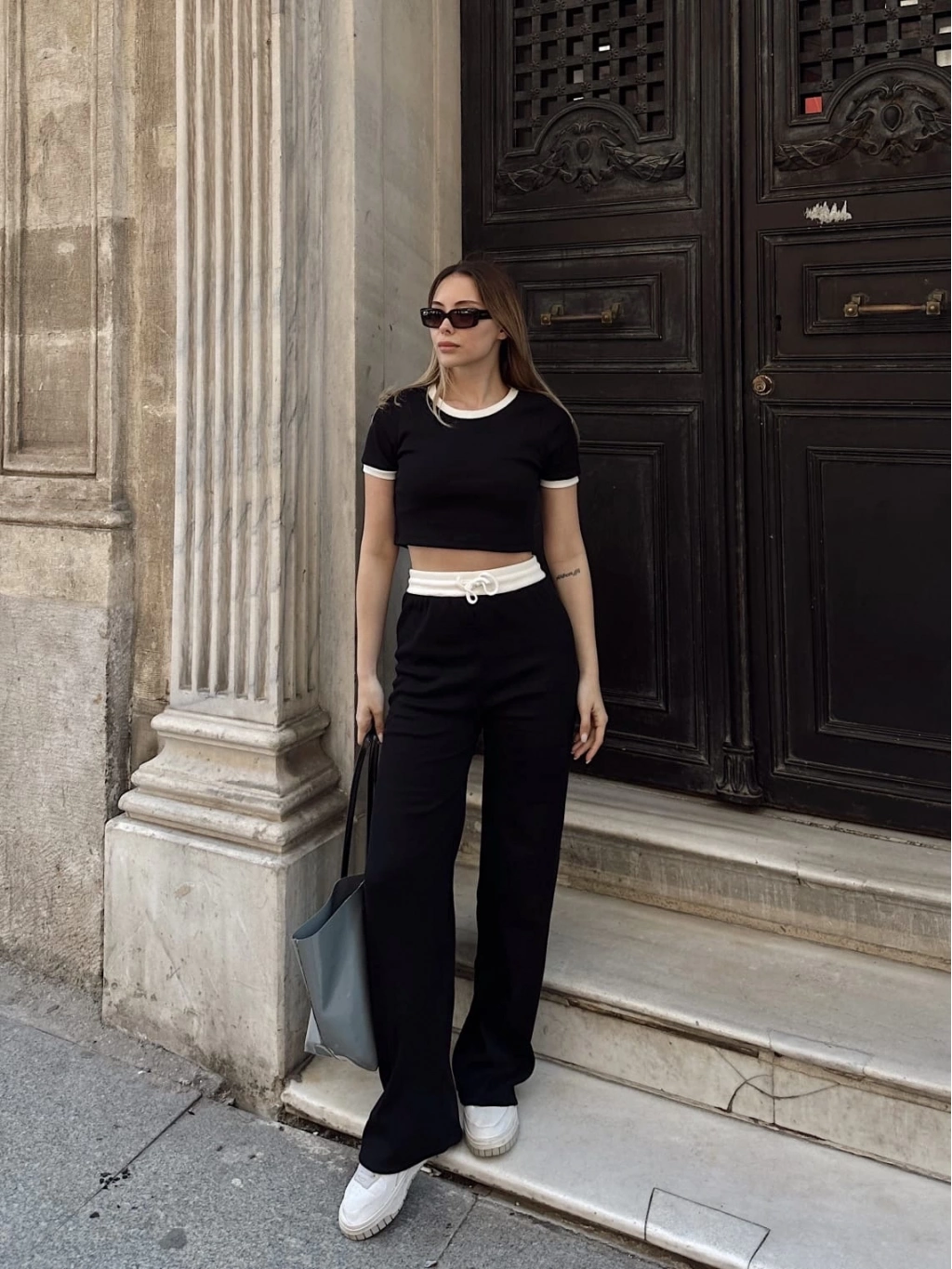 Şıklığı ve rahatlığı bir arada sunan Crop Pantolon Biyeli Takım Siyah, gardırobunuzun vazgeçilmezi olmaya aday!