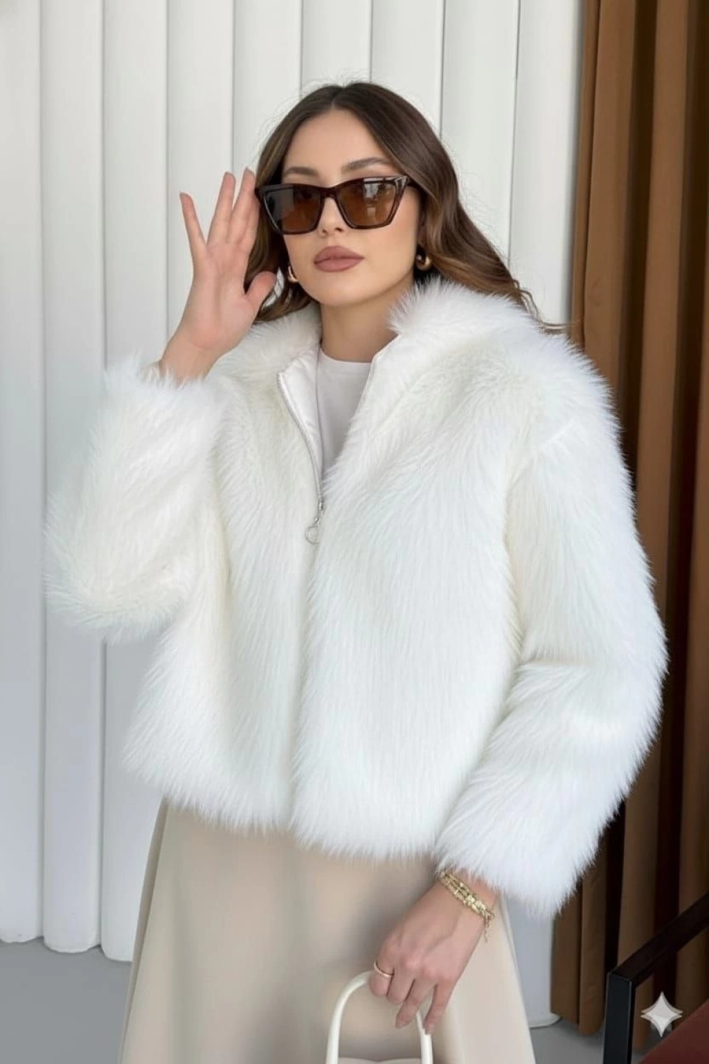 Fermuarlı kısa kürk beyaz t7746
