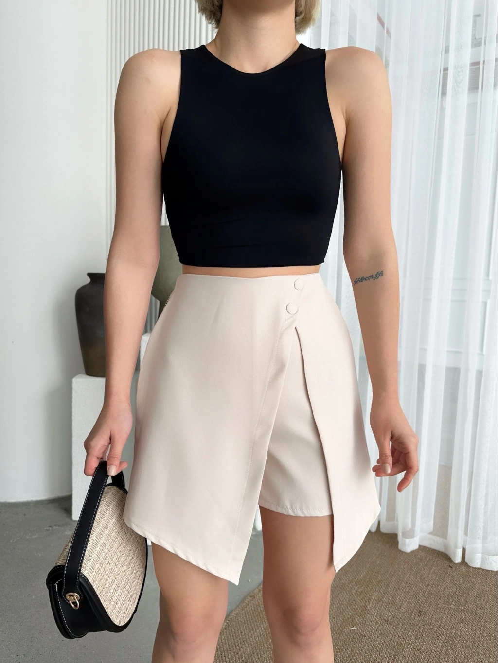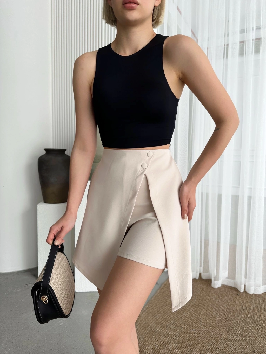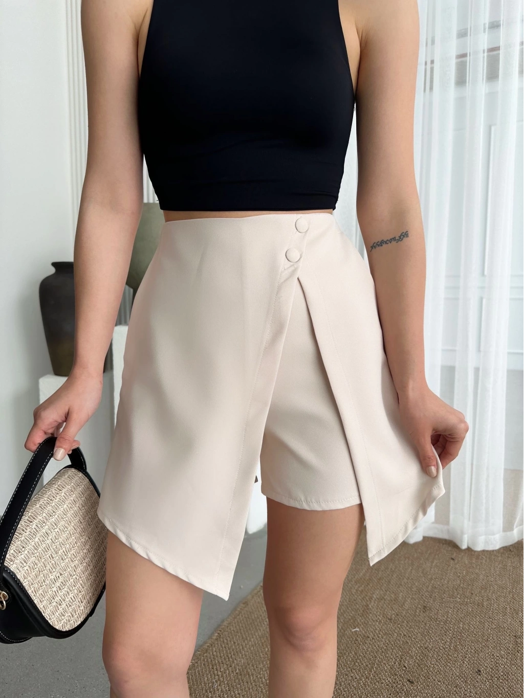 İki düğmeli şort eteğimiz, şıklığı ve rahatlığı bir arada sunar. Hem spor hem de şık kombinler oluşturabileceğiniz bu etek, gardırobunuzun vazgeçilmez parçalarından biri olmaya aday.