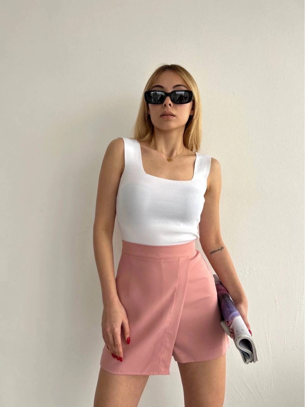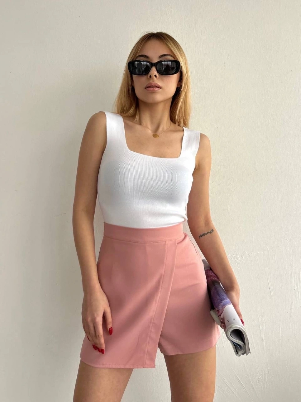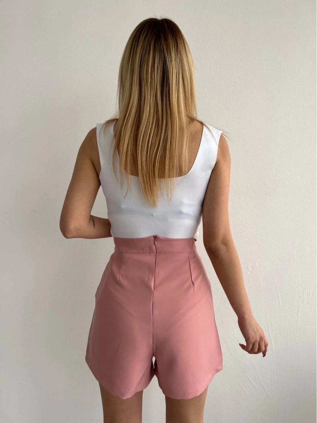 Bu harika pudra rengi şort eteği, günlük hayatta veya özel günlerde şıklıkla tercih edebilirsiniz.