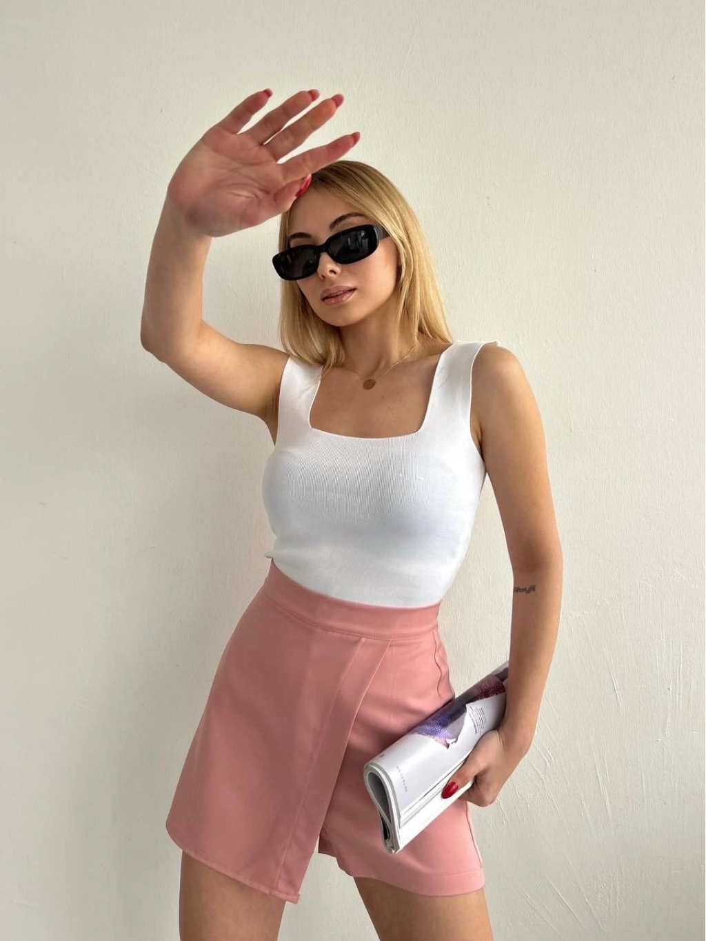 Kapaklı şort etek pudra S208, şıklık ve rahatlığı bir arada sunar.