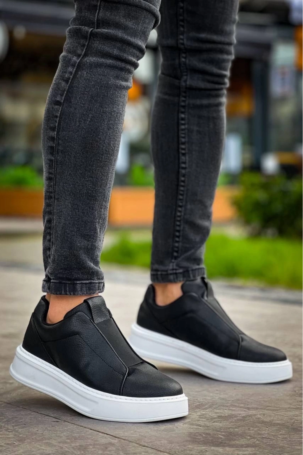 KB-007 Siyah Beyaz Yüksek Taban Tek Bant Bağcıksız Günlük Erkek Ayakkabı