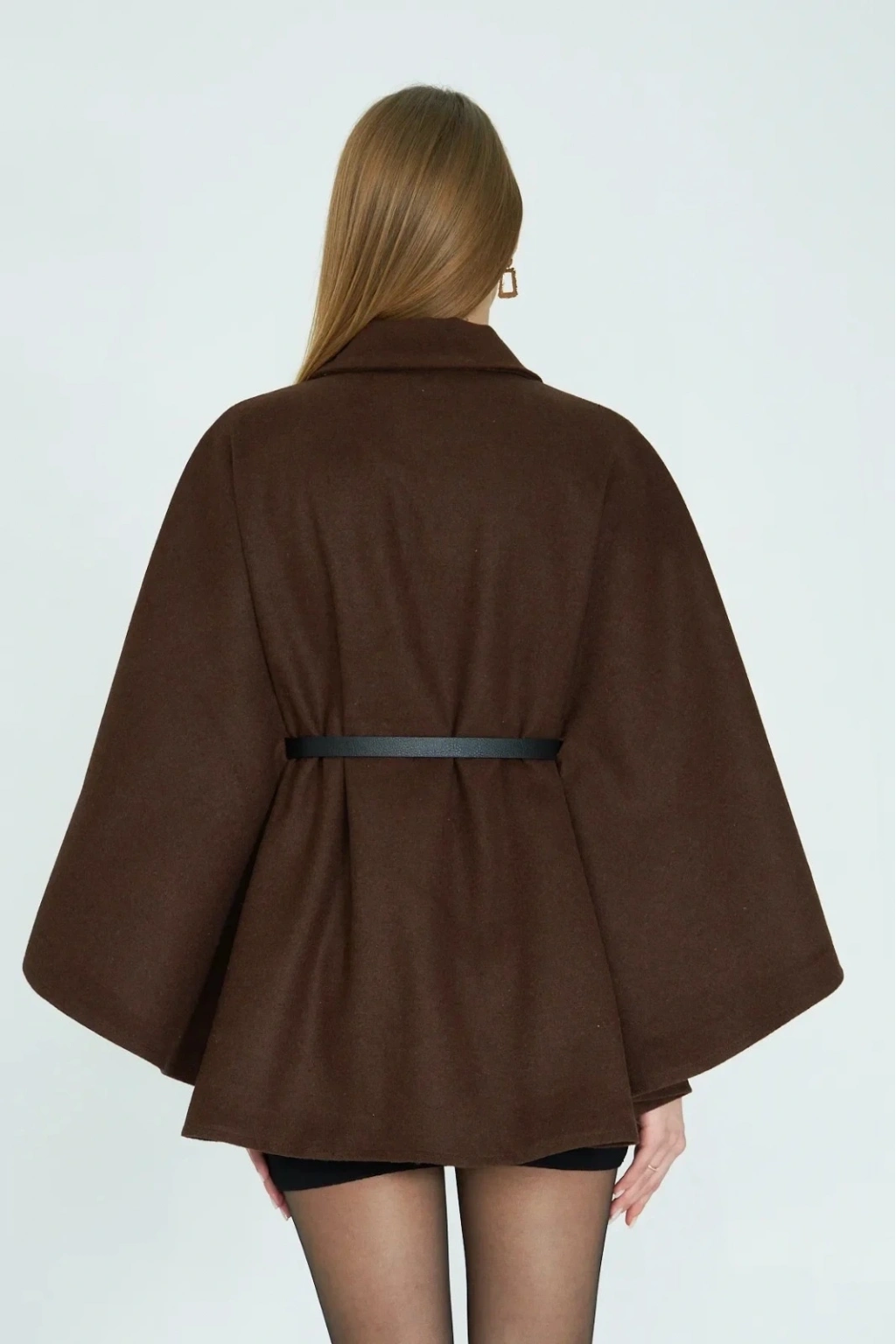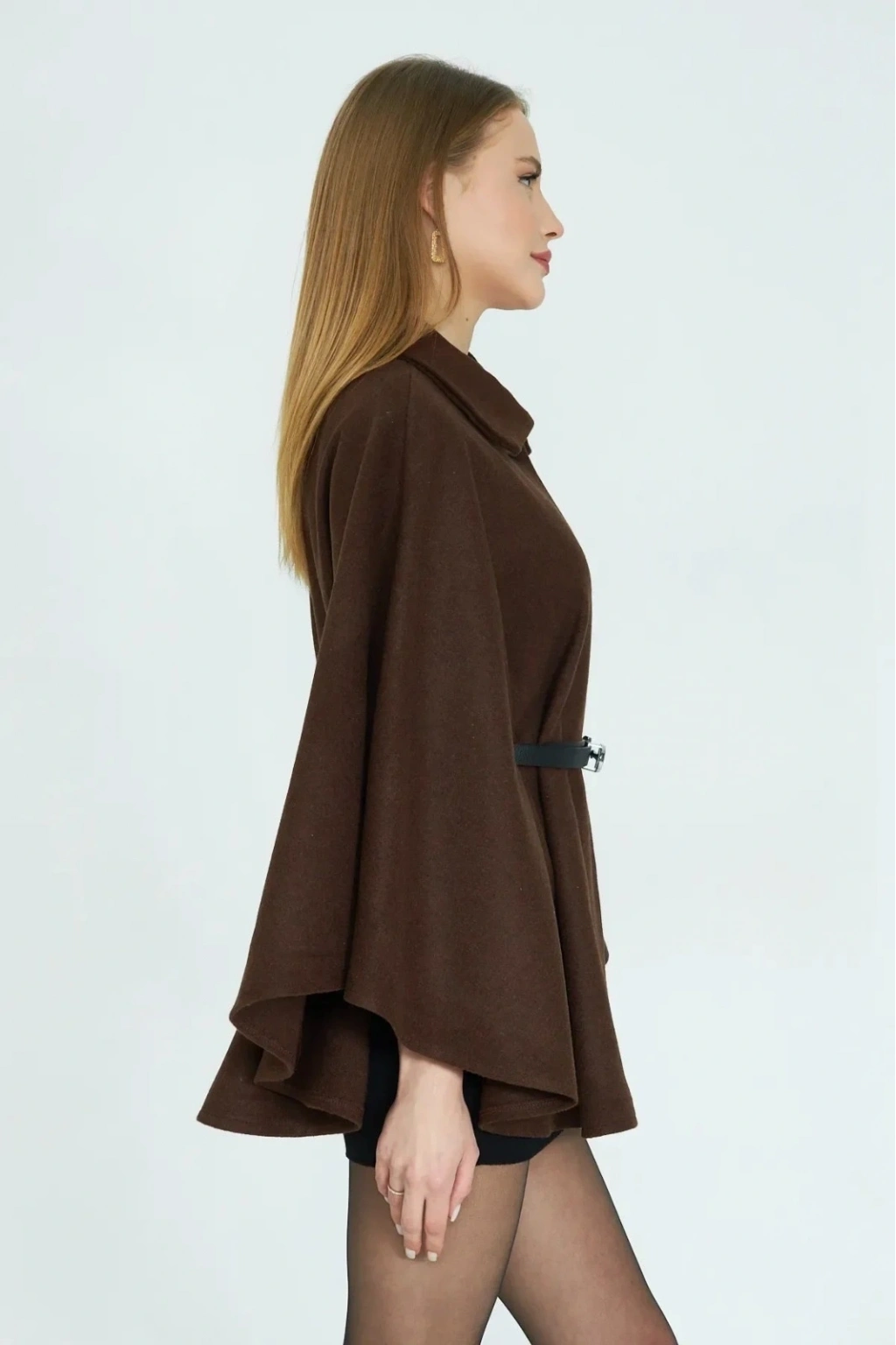 Kahve rengi kemerli kaşe panço şıklık ve rahatlığı bir arada sunuyor. Soğuk havalarda sıcacık tutarken, şık tasarımıyla her kombini tamamlıyor.