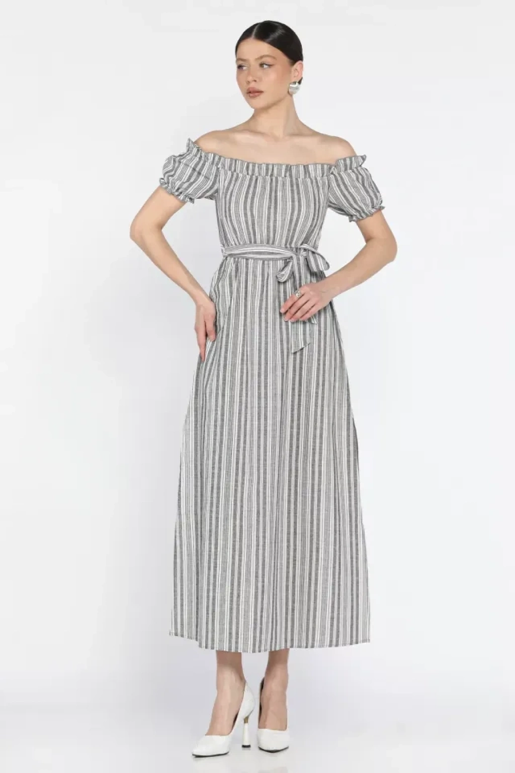Madonna yaka midi yırtmaçlı kuşaklı keten elbise, gardırobunuzun şıklığını tamamlayacak bir parçadır.