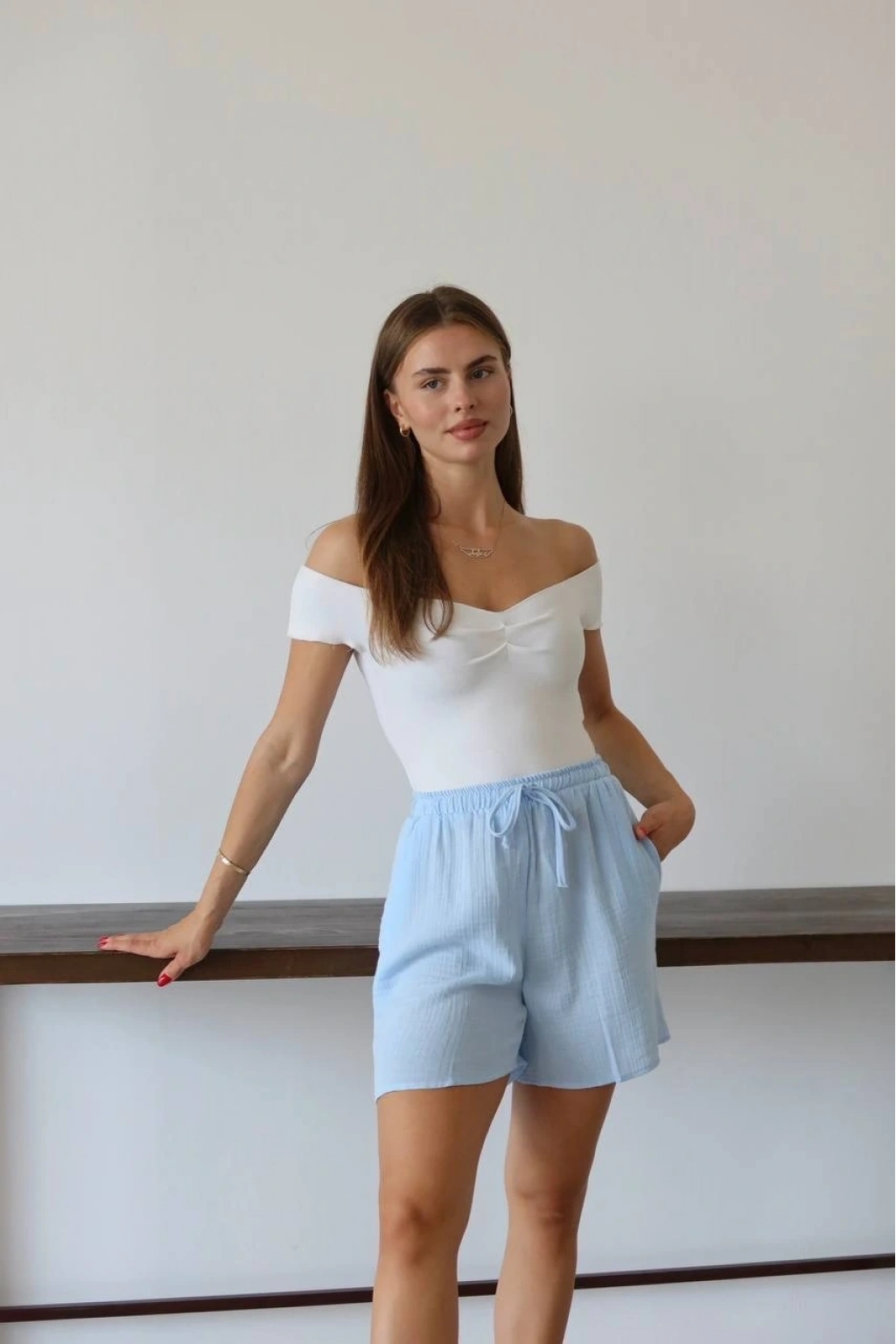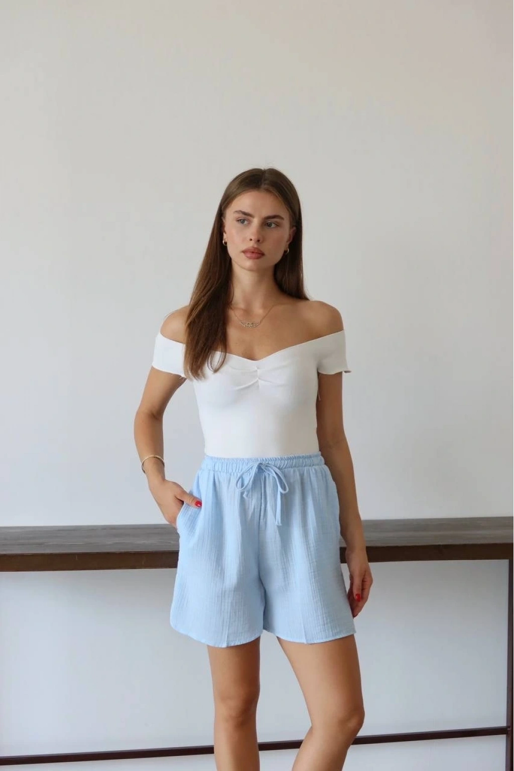 Bu mavi şort, yaz aylarında rahat ve şık bir seçenektir. Bağcıklı tasarımı sayesinde bel kısmını istediğiniz şekilde ayarlayabilirsiniz. Yüksek kaliteli müslin kumaştan üretilmiştir ve cilt dostudur. Hem günlük kullanıma hem de plaj günlerine uygun bir parçadır.