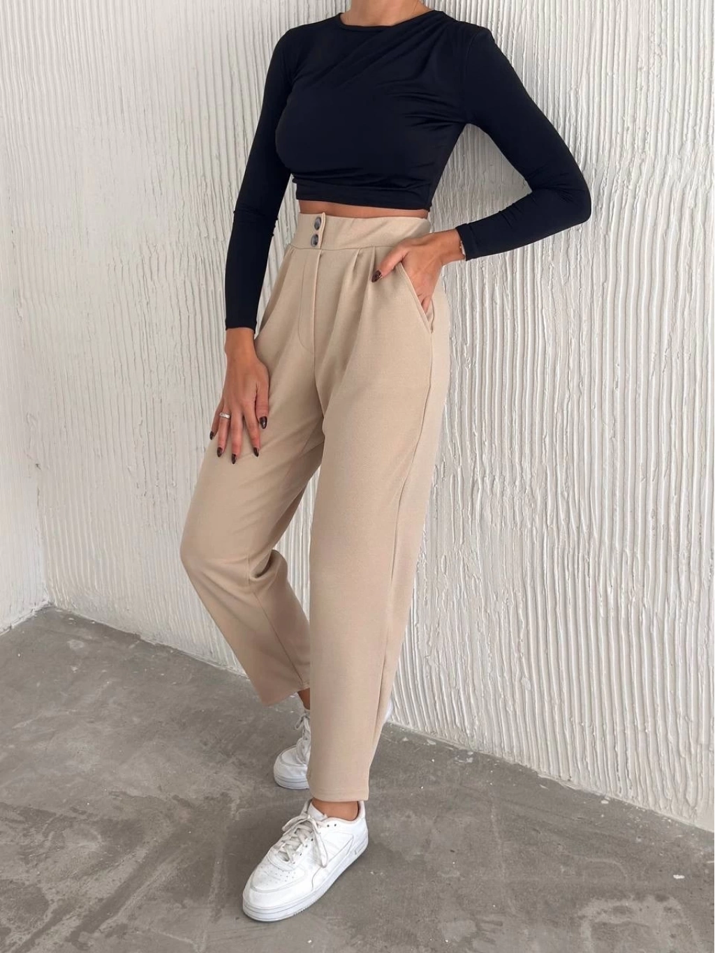 örme krep pantolon çift düğmeli modeli, şıklığı ve konforu bir arada sunar.