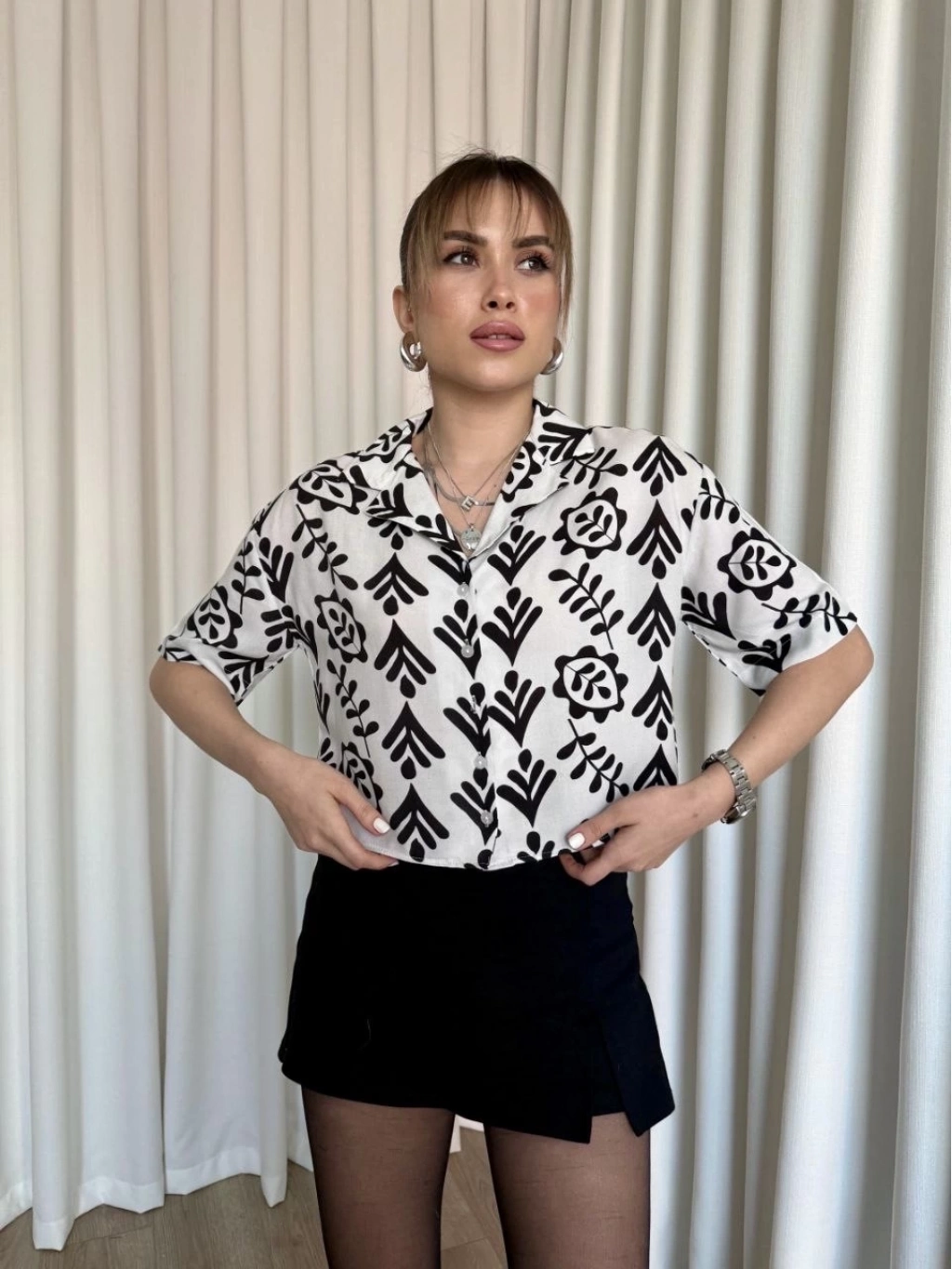 Siyah beyaz baskılı crop gömlek