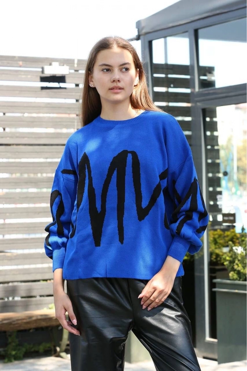 Siyah çizgili bisiklet yaka kazak Saks