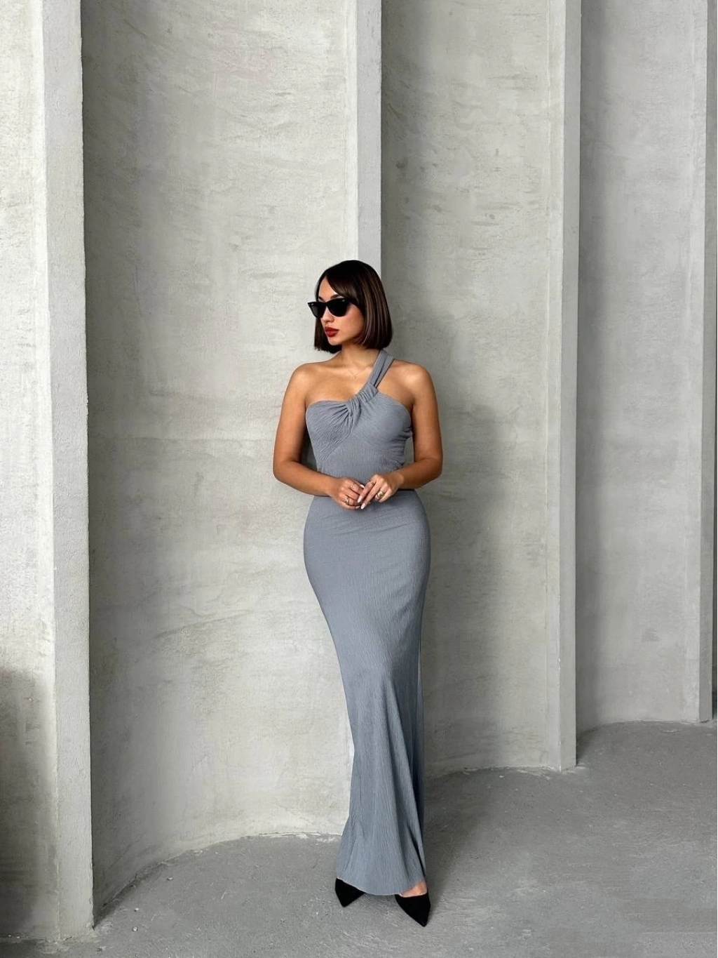Tek omuz pliseli elbise