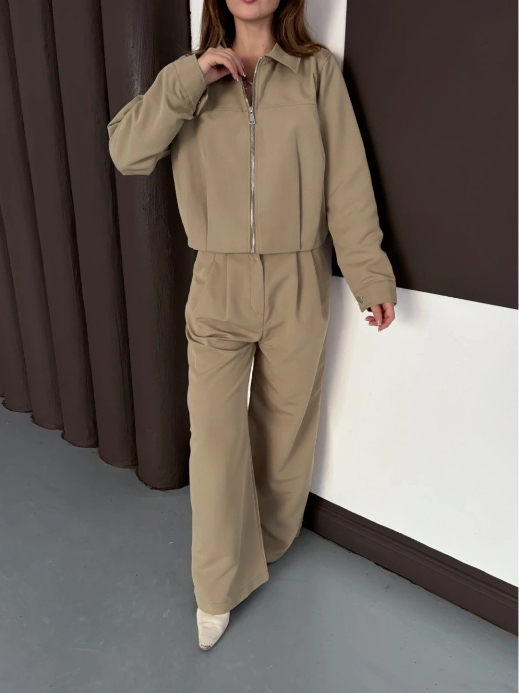 Renkli ve şık bir kombin için Trenç Takım Alt Üst Haki Ons!