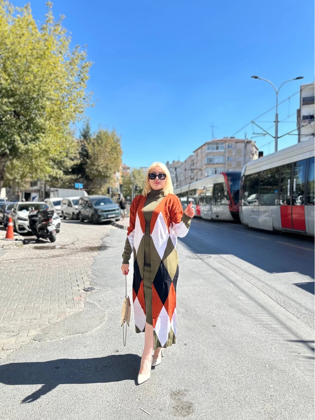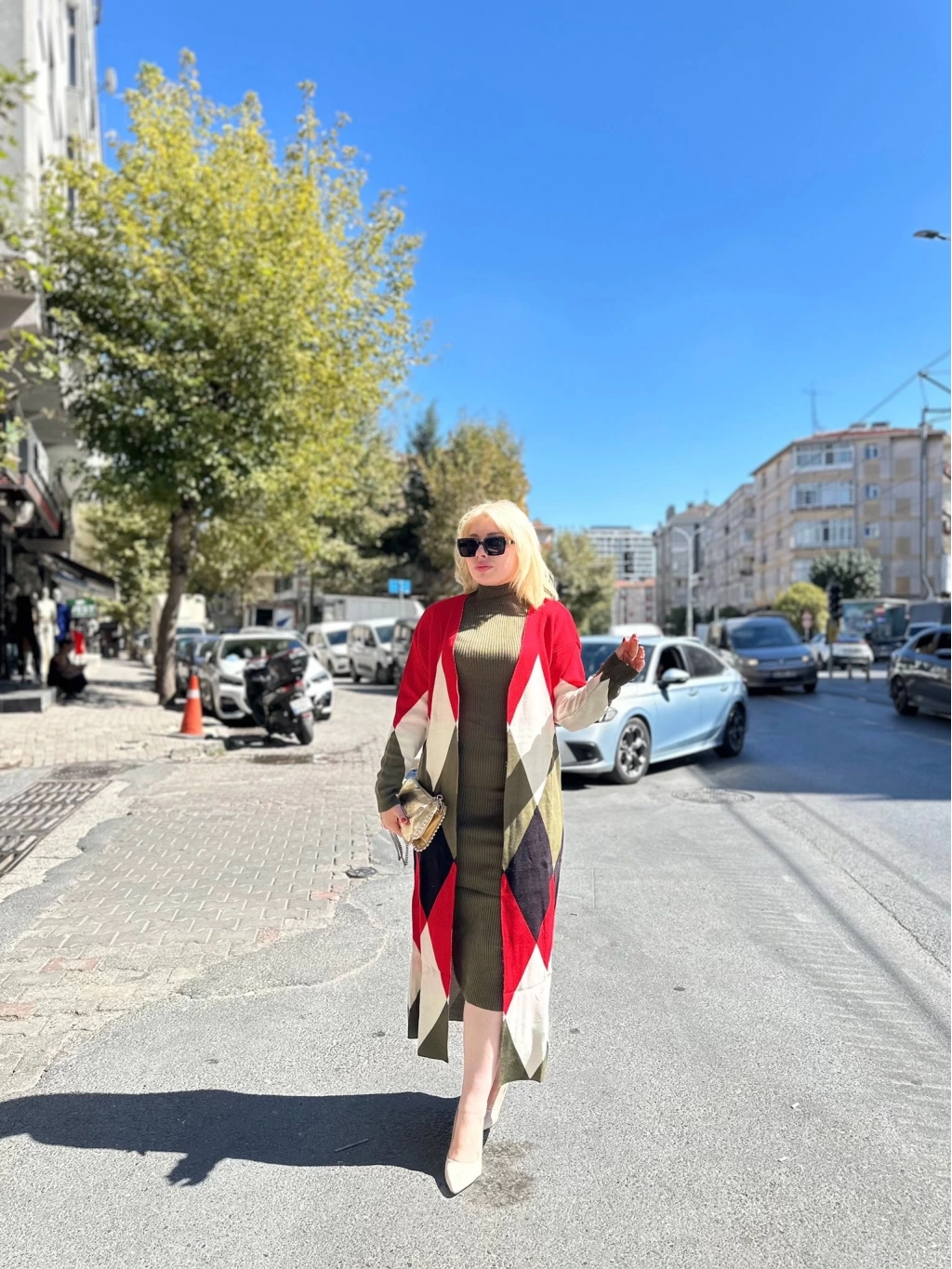 Uzun hırka içi elbise ikili triko takım, gardırobunuzun vazgeçilmezi olmaya aday! Ekose desenli baklava deseni, haki ve kırmızı renklerin uyumuyla şıklığı ve rahatlığı bir arada sunuyor.