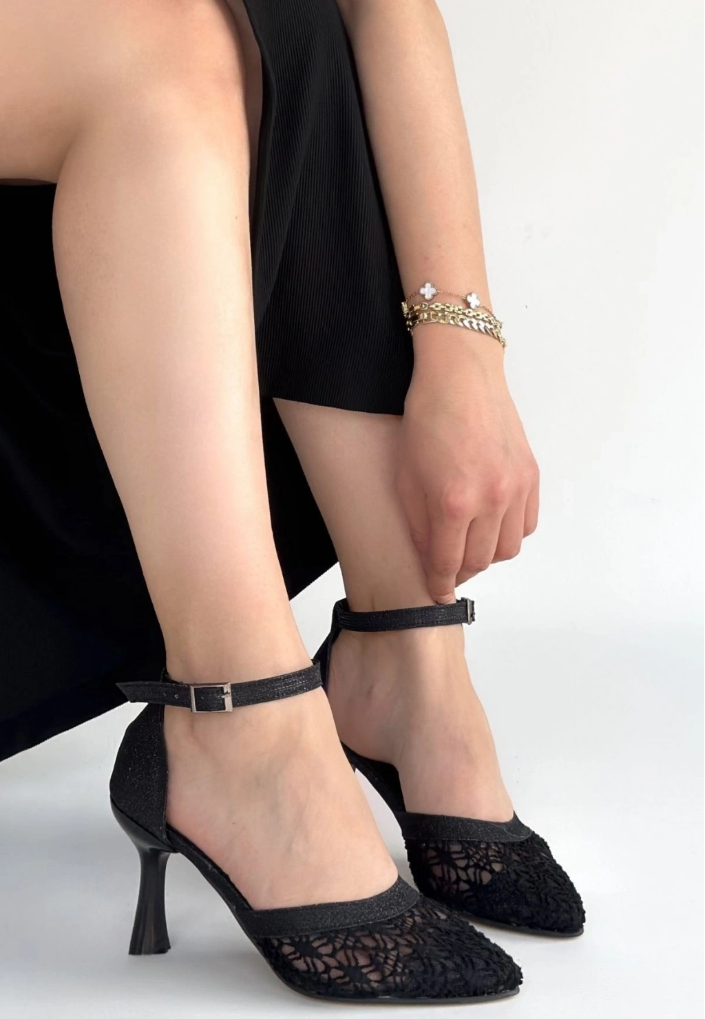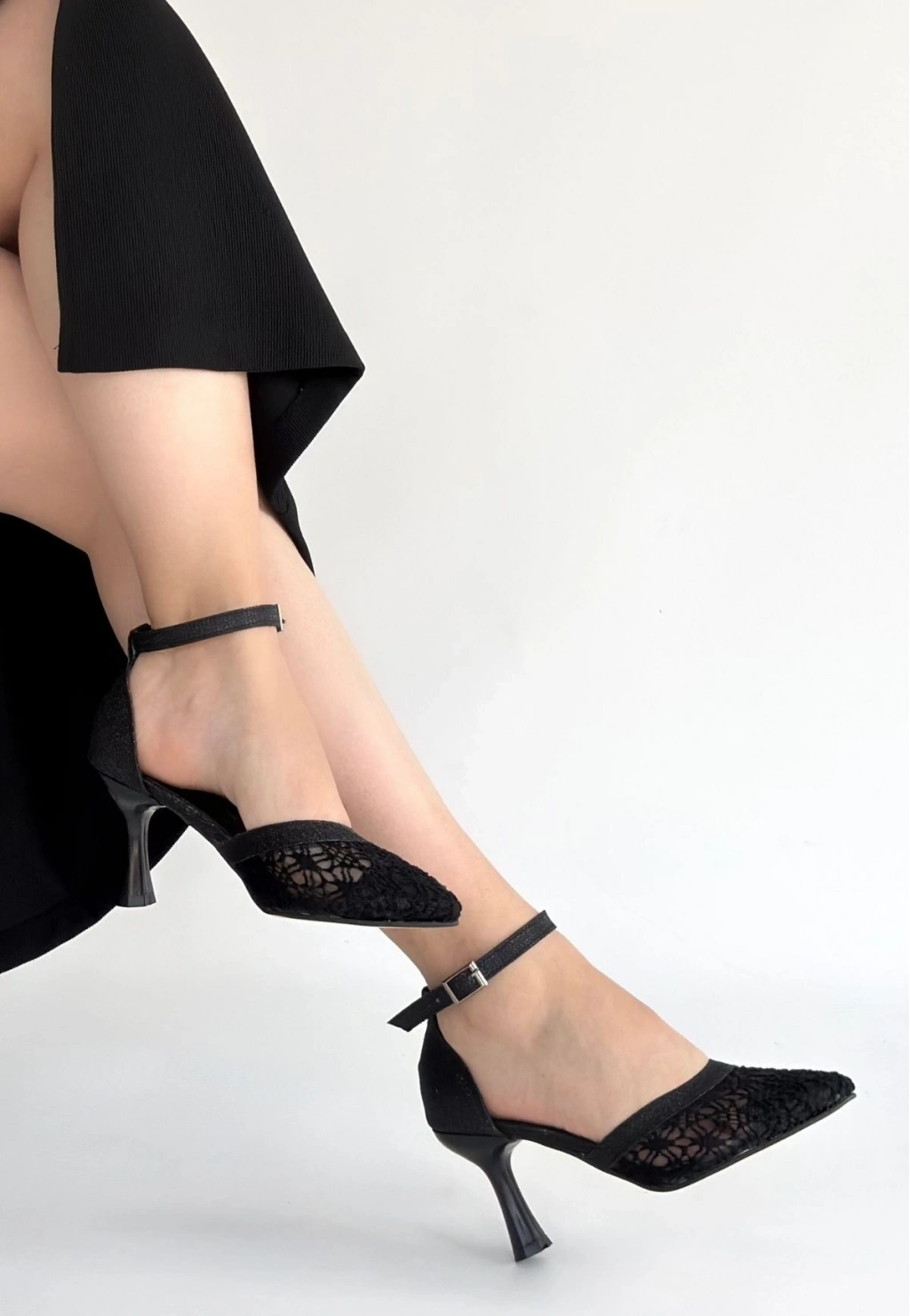 Weja Siyah Cilt Tül Detaylı Topuklu Ayakkabı