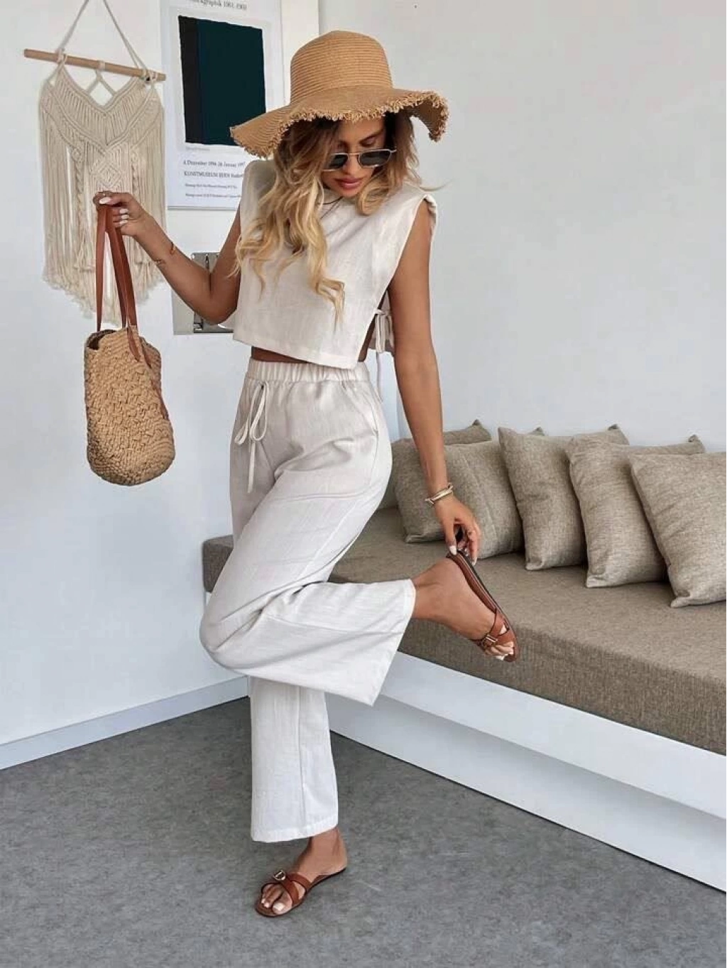 Yan bağlama detaylı pantolonlu takım bej, zarif ve şık bir seçenektir. Tarzınızı yansıtmak için ideal bir tercihtir.