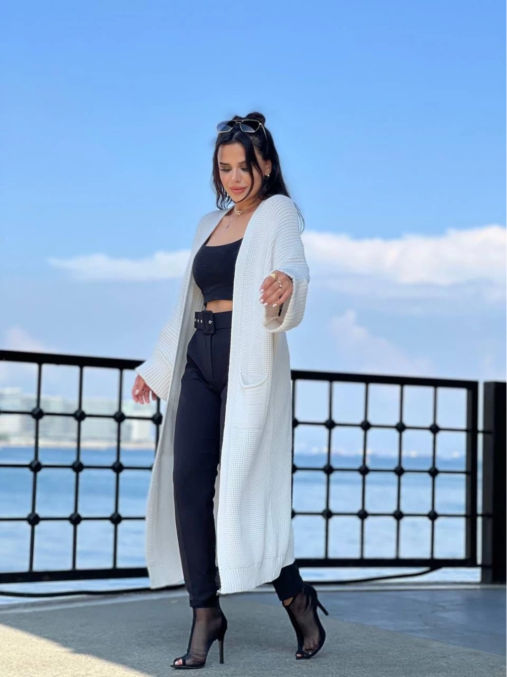 Yarasa kol uzun triko hırka beyaz, hem şıklığı hem de rahatlığı bir arada sunar.
