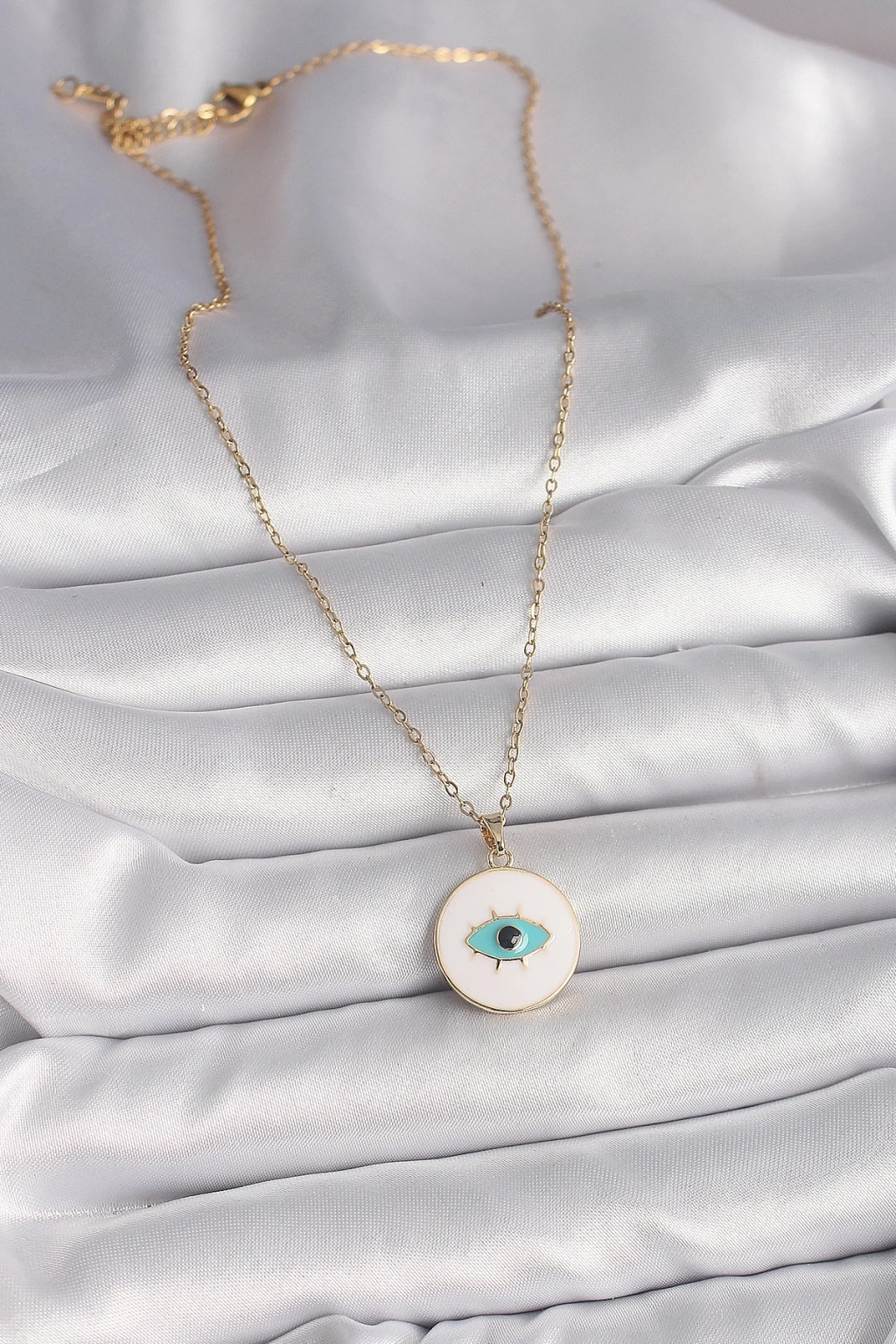 ® 316L Çelik Gold Renk Zincir Beyaz Mineli Turkuaz Göz İşleme Model Kadın Kolye