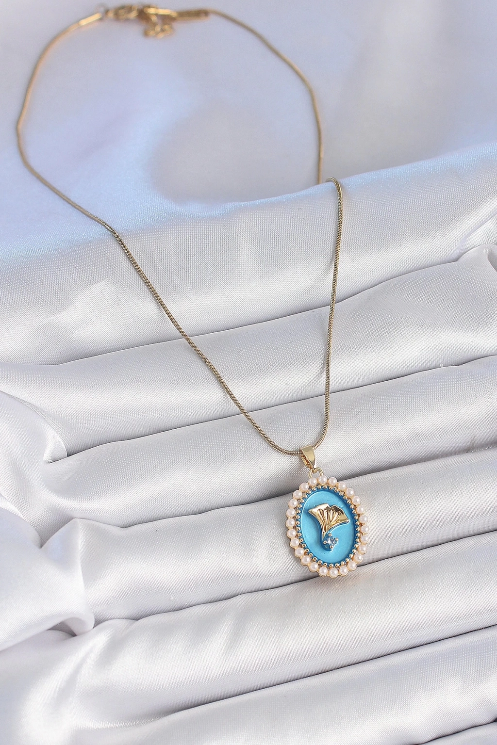® 316L Çelik Gold Renk Zincir Mavi Mineli İncili Zirkon Taşlı Çiçek İşlemeli Portre Model Kadın Kolye