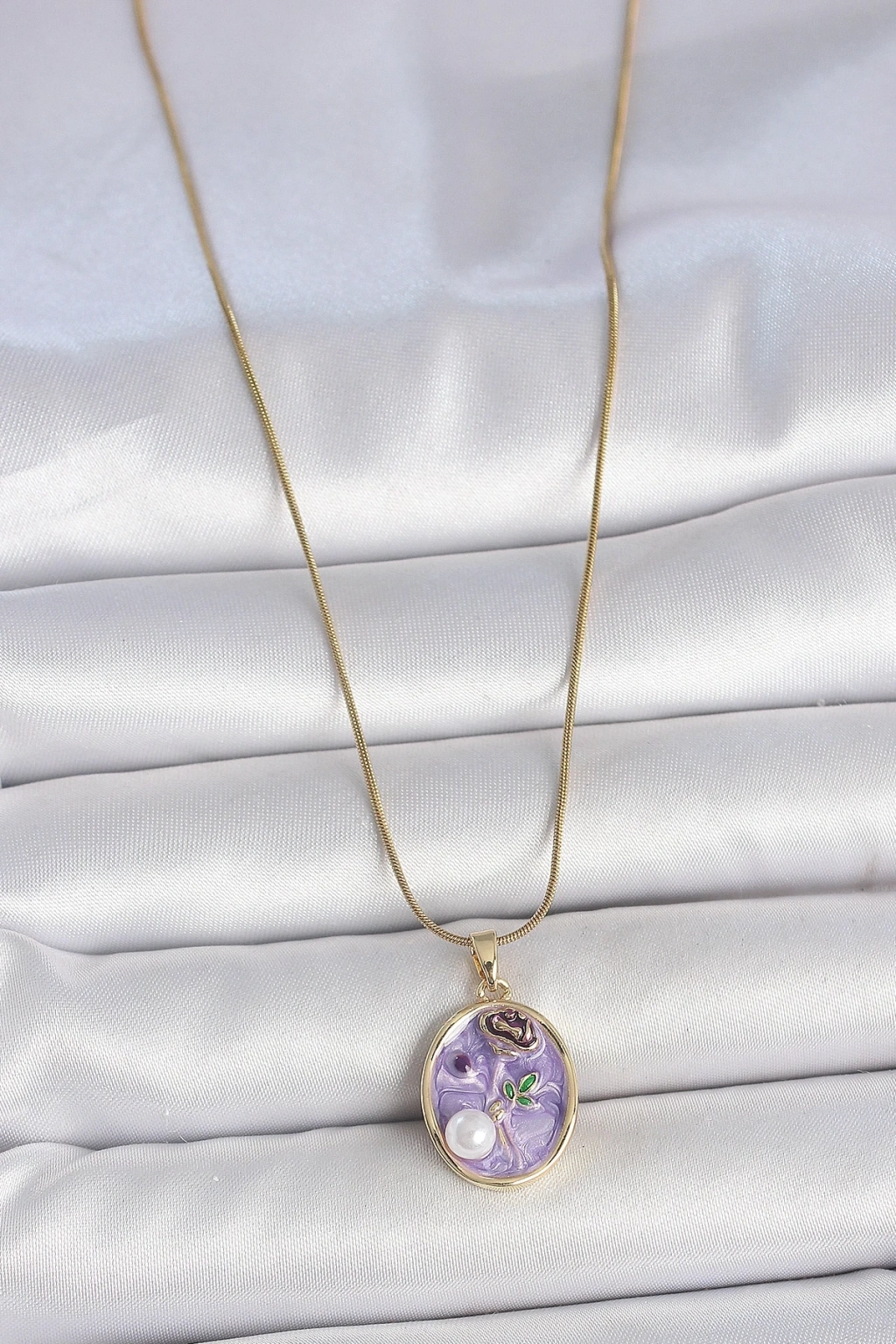 ® 316L Çelik Gold Renk Zincir Mor Çiçek İşlemeli İnci Detay Portre Model Kadın Kolye