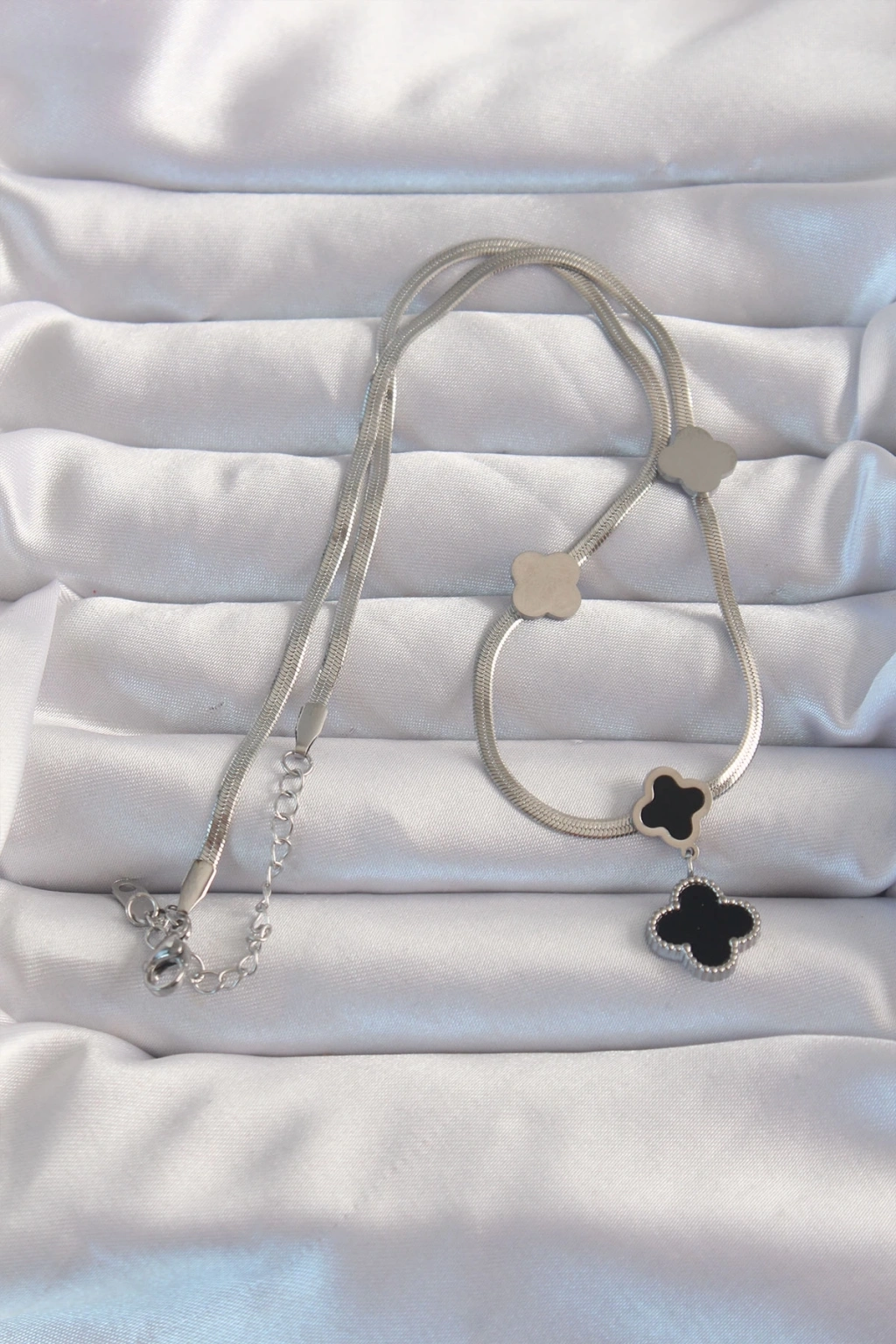 ® 316L Çelik Gümüş Renk İtalyan Zincirli Mineli Yonca Kolye