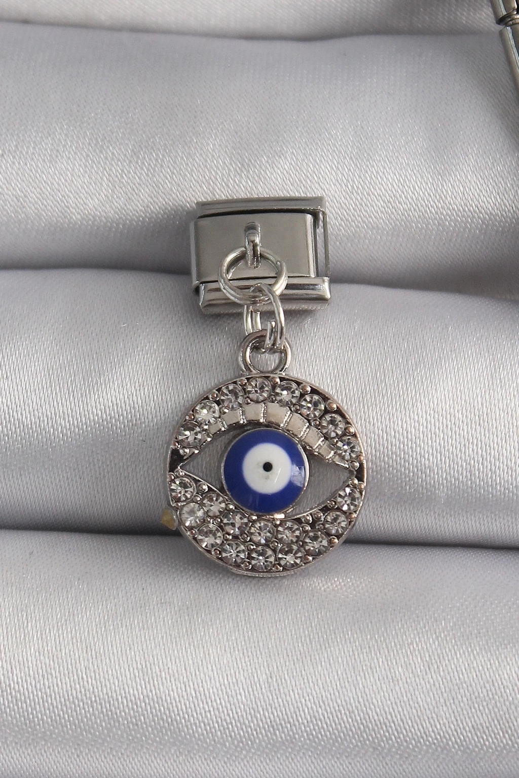 ® 316L Çelik Gümüş Renk Sallantı Zirkon Taşlı Göz Model Nazar Boncuk Detay Nomination Charm