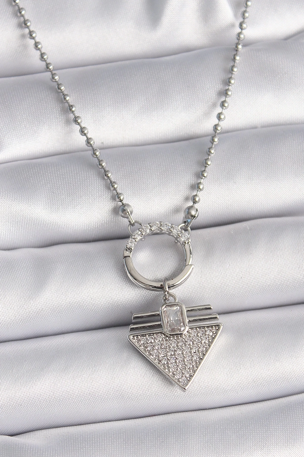 ® 316L Çelik Gümüş Renk Topçuk Zincir Zirkon Taşlı Üçgen Model Kadın Kolye