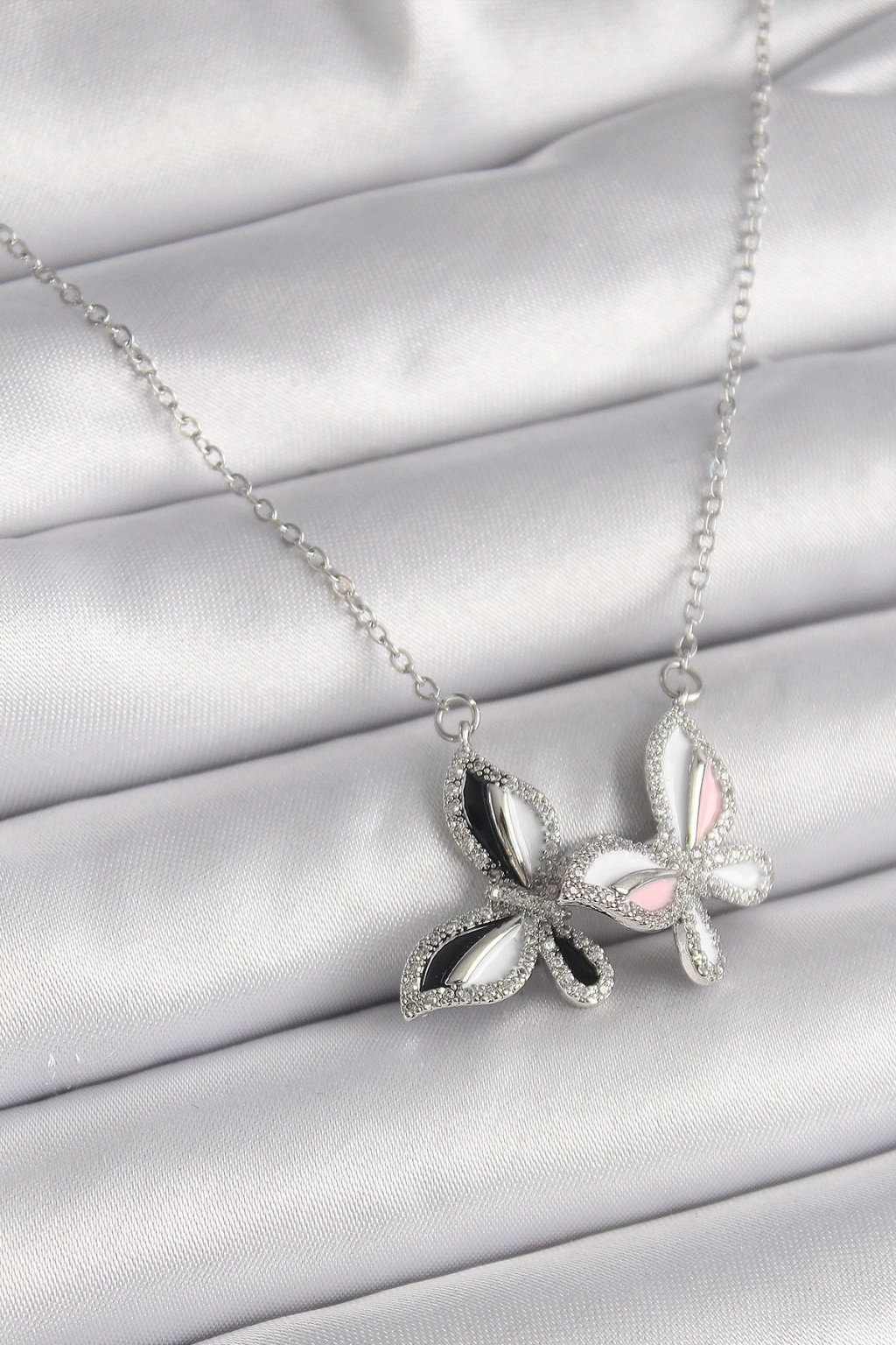 ® 316L Çelik Gümüş Renk Zincir Zirkon Taşlı Renkli Kelebek Model Kadın Kolye