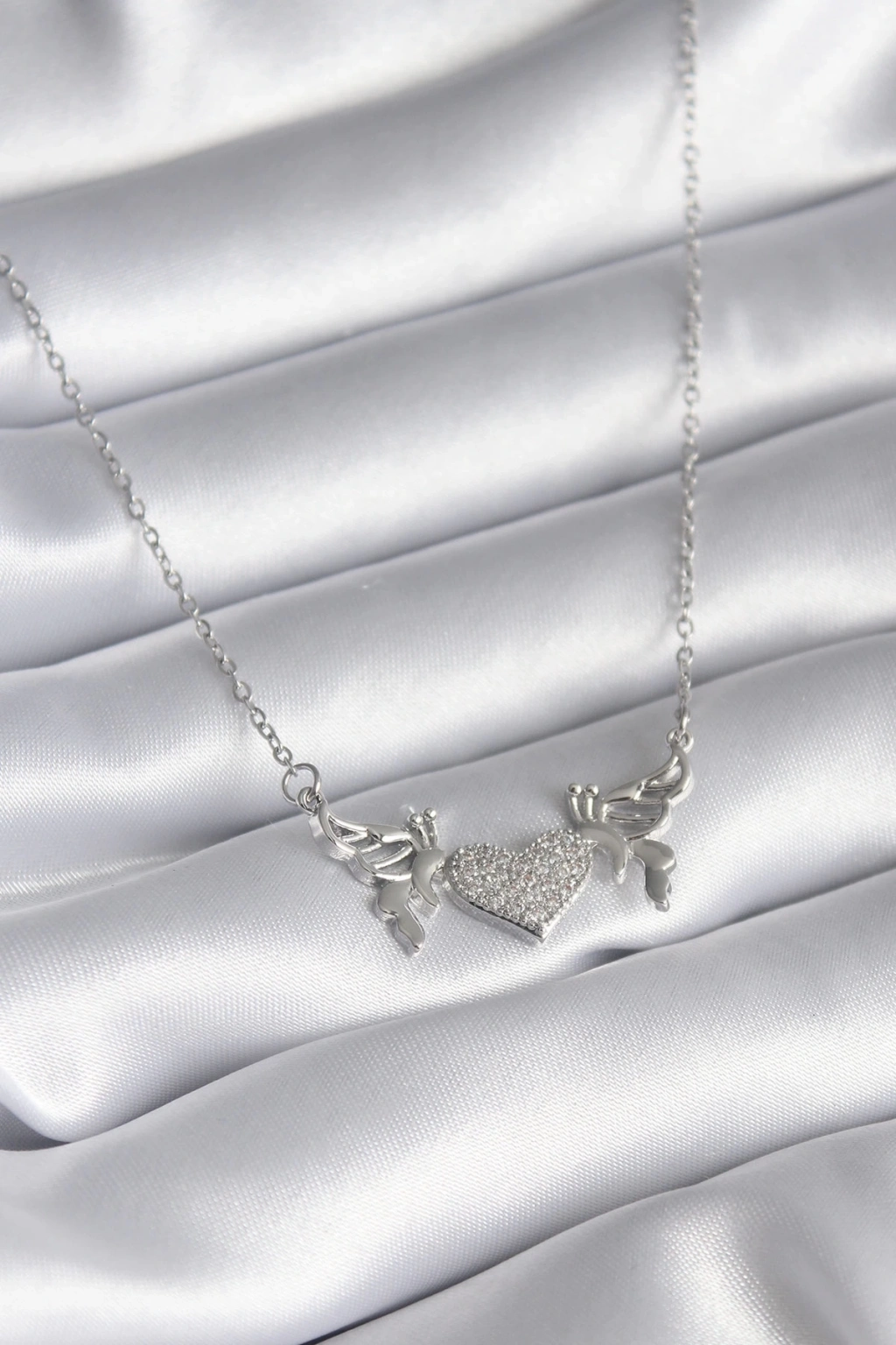 ® 316L Çelik Gümüş Renk Zirkon Taşlı Kanat Kalp Model Kadın Kolye