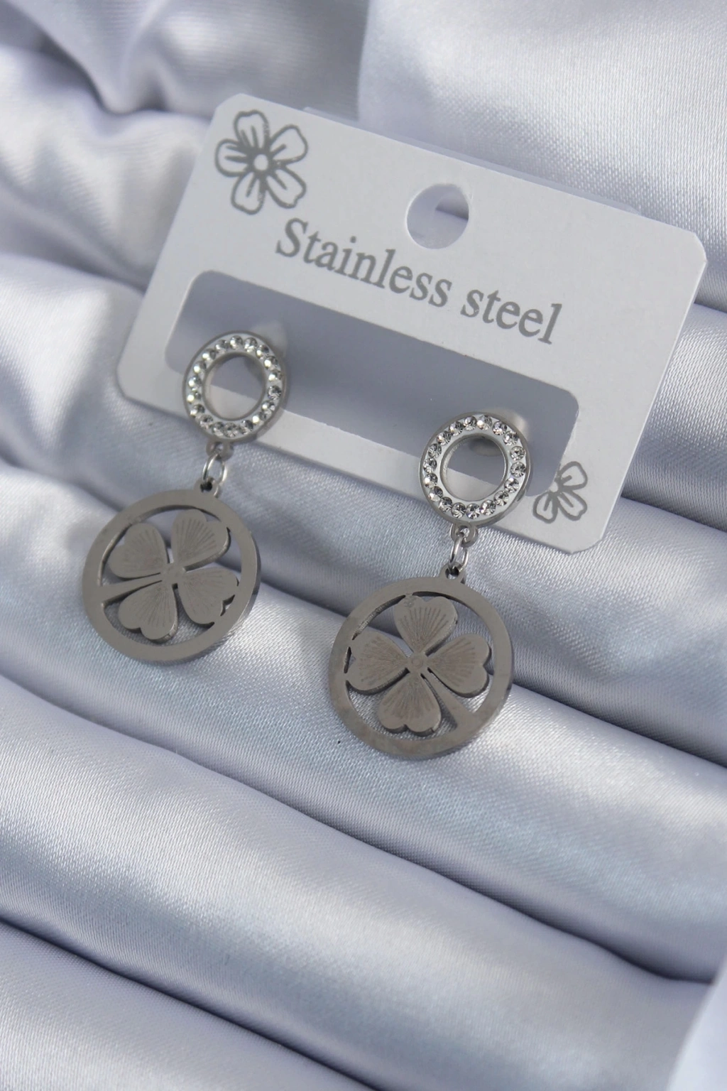 ® 316L Çelik Gümüş Renk Zirkon Taşlı Yonca Model İşleme Detay Kadın Küpe