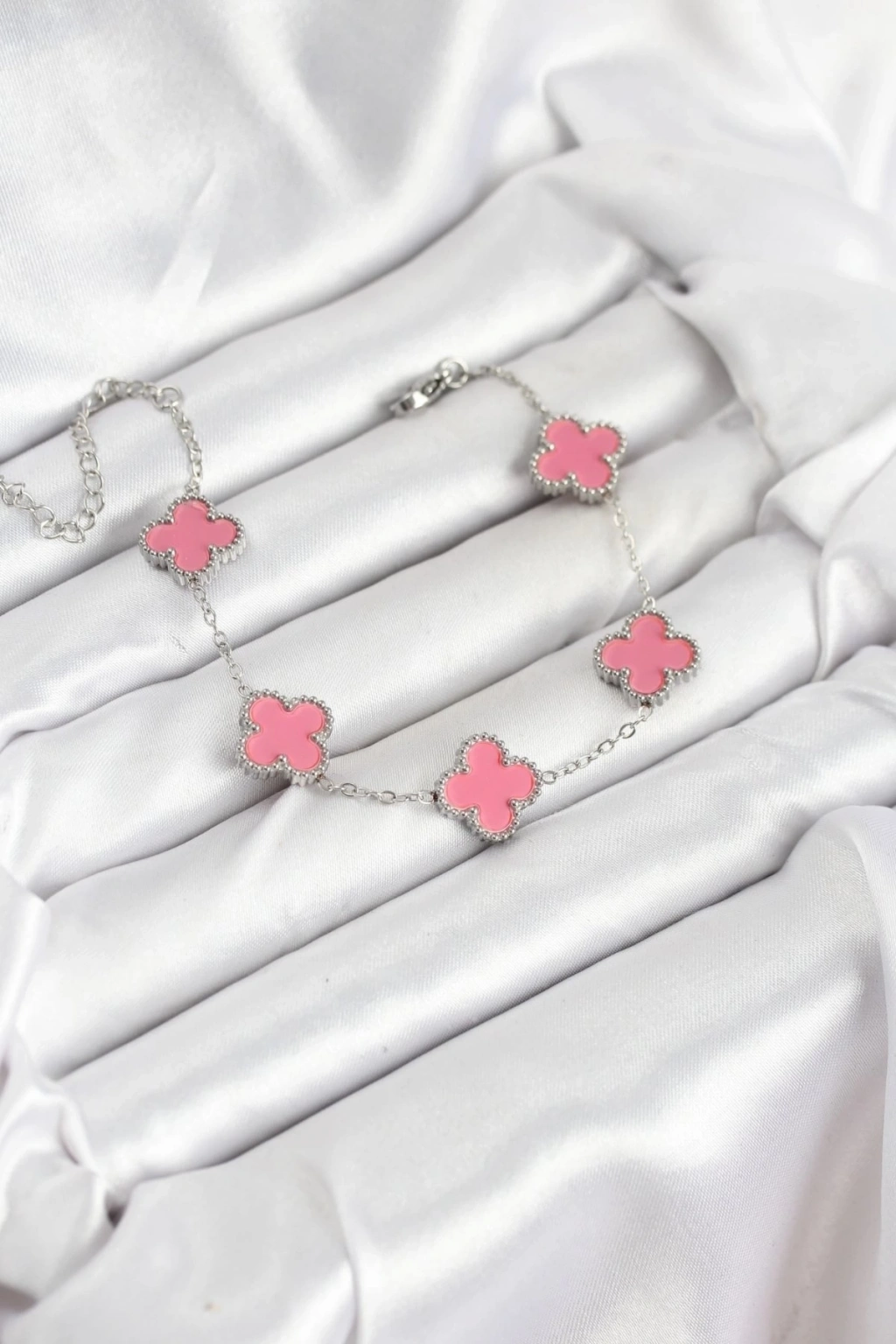 ® 316L Çelik Gümüş Zincir Pembe Renk Yonca Bileklik
