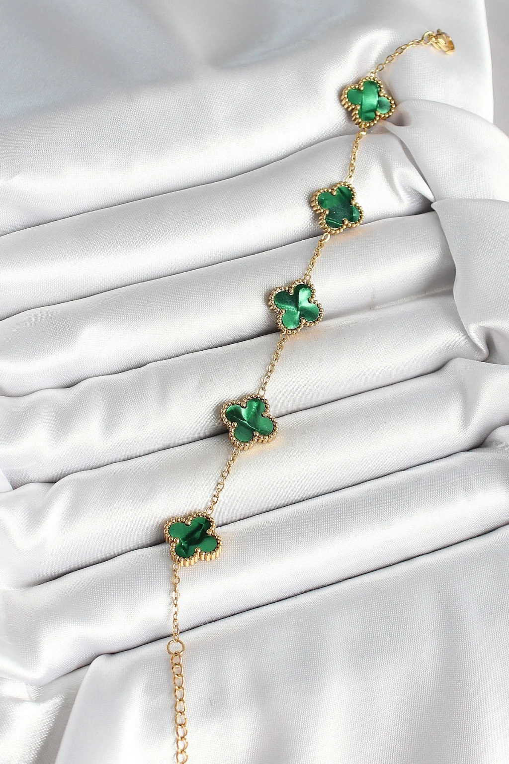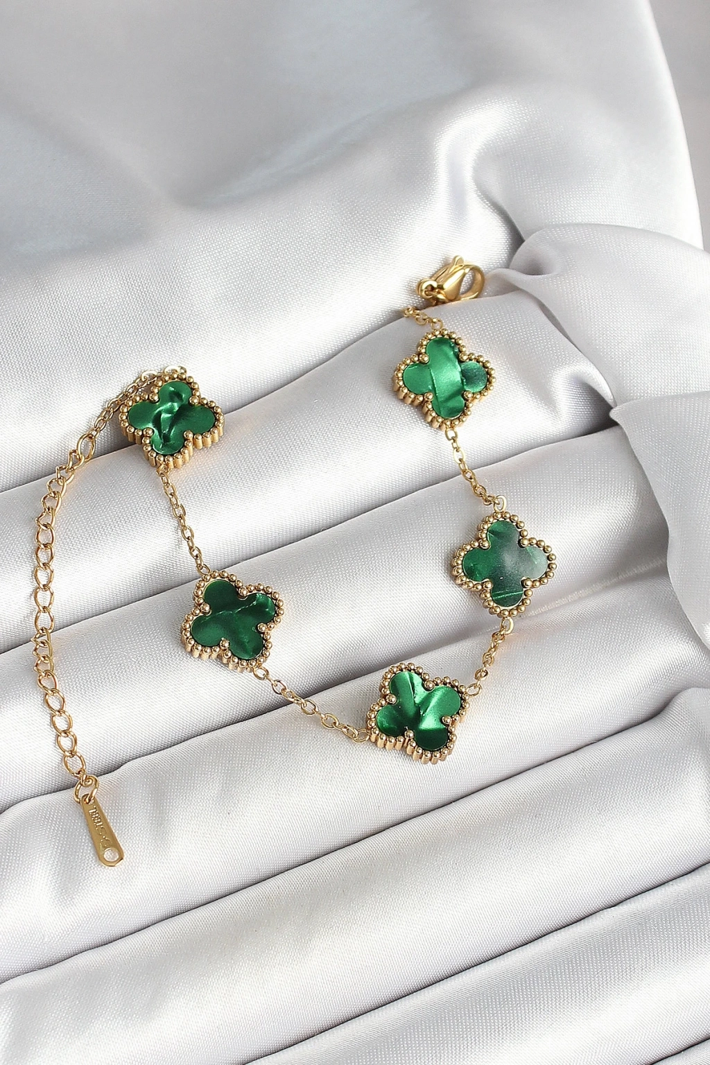 ® 316L Çelik Sedefli Zümrüt Yeşil Gold Renk Yonca Kadın Bileklik
