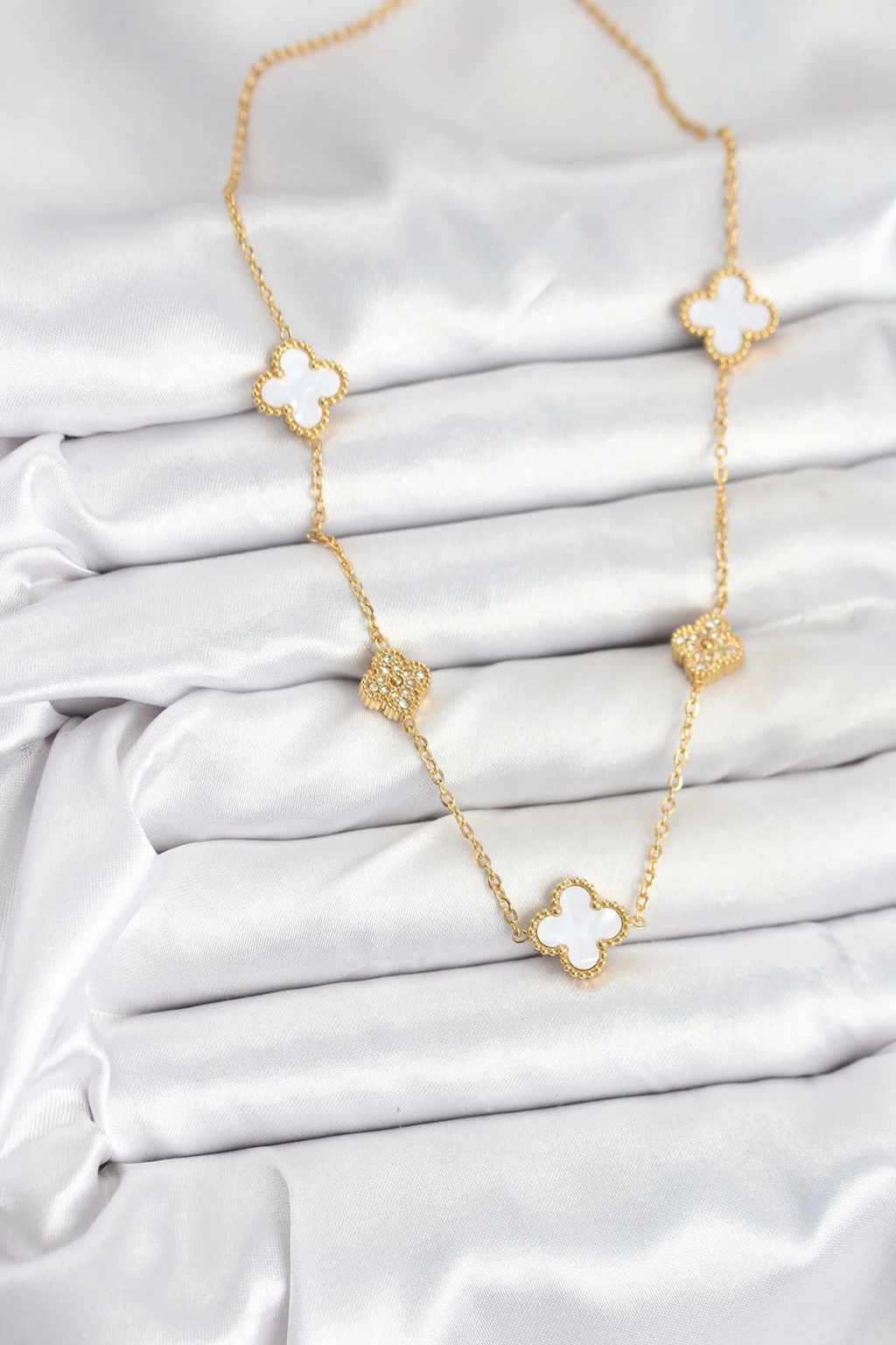 ® 316L Çelik Zincir Gold Renk Beyaz ve Zirkon Taşlı Yonca Kadın Kolye
