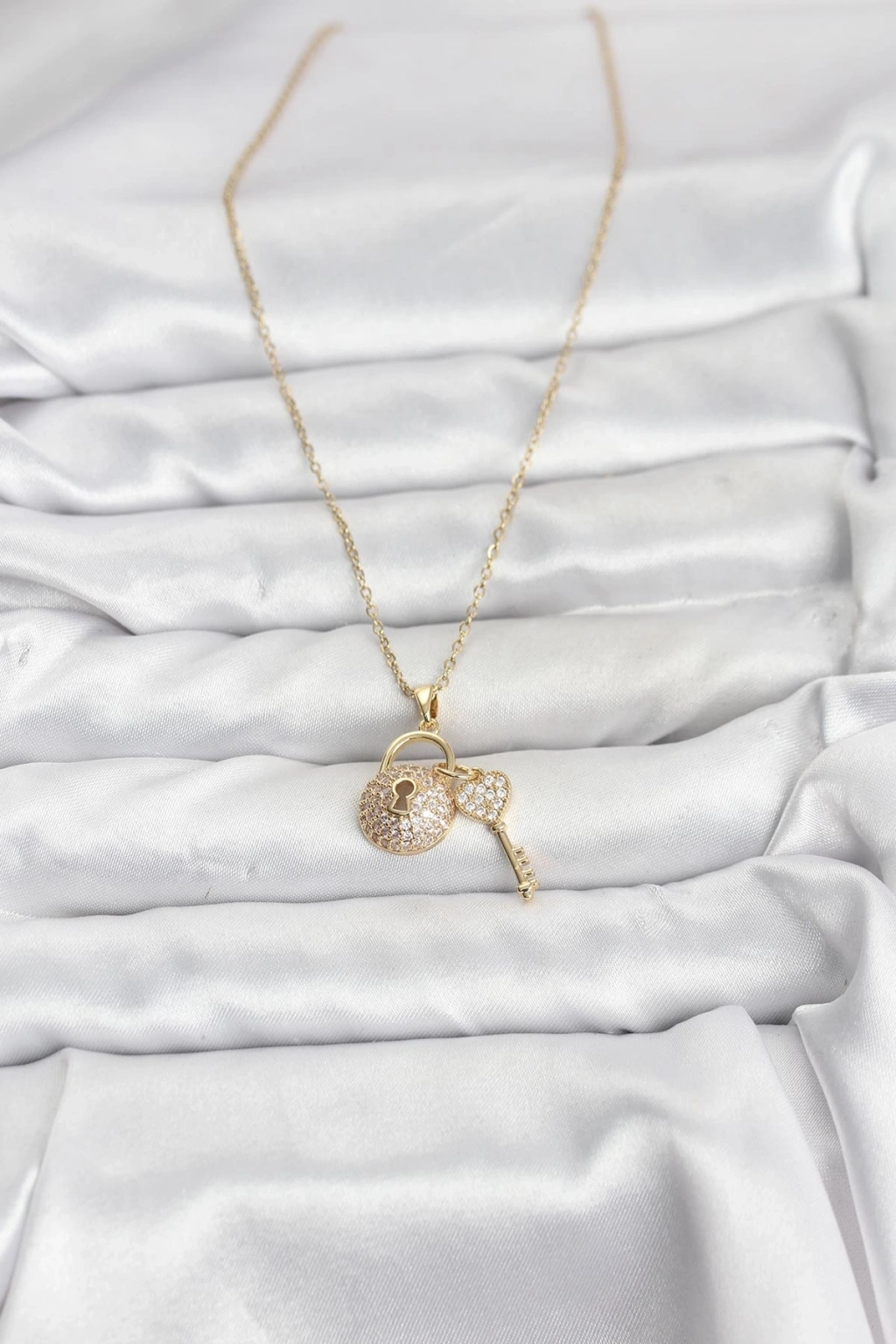 ® 316L Çelik Zincir Gold Renk Kilit Anahtar Model Zirkon Taşlı Kadın Kolye