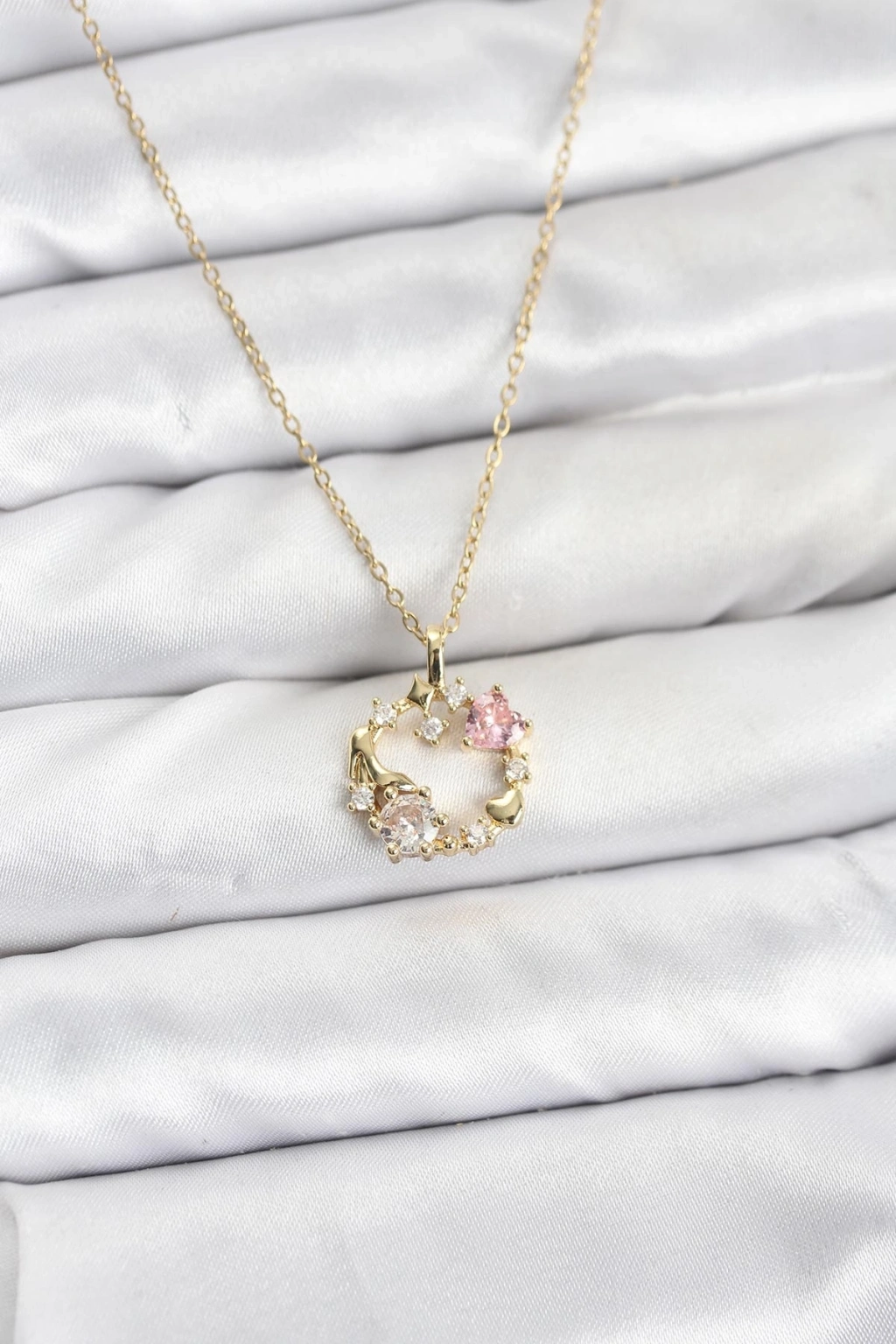 ® 316L Çelik Zincir Gold Renk Pembe Taş Detaylı Çelenk Model Kadın Kolye