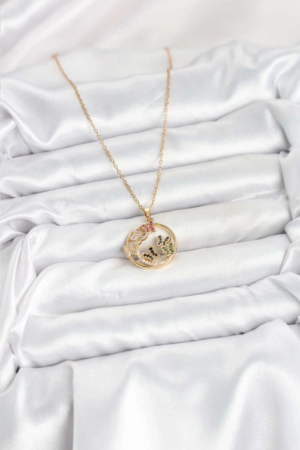 ® 316L Çelik Zincir Gold Renk Zirkon Taşlı Kelebekli Kadın Kolye