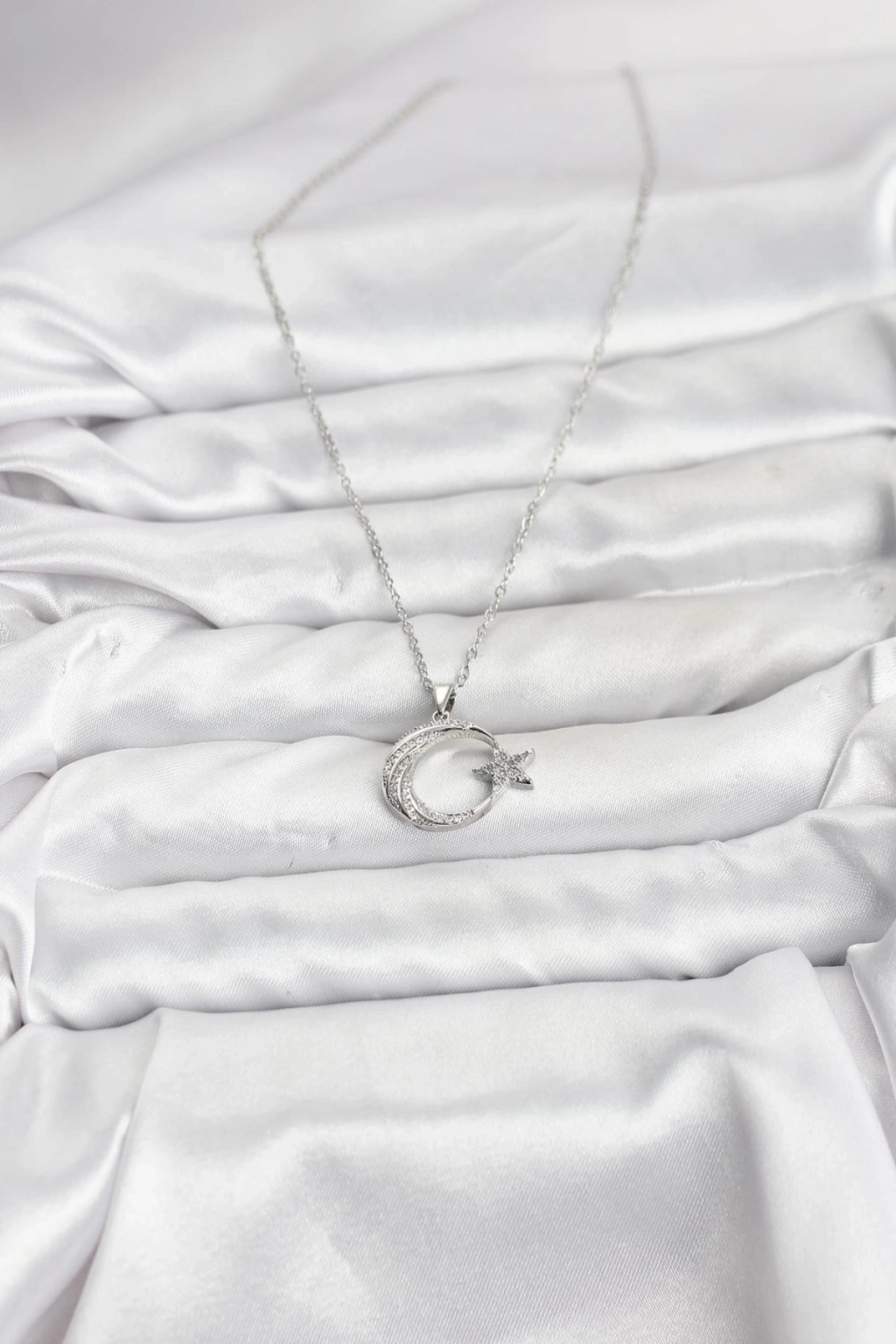 ® 316L Çelik Zincir Gümüş Renk Ay Yıldız Model Zirkon Taşlı Kadın Kolye