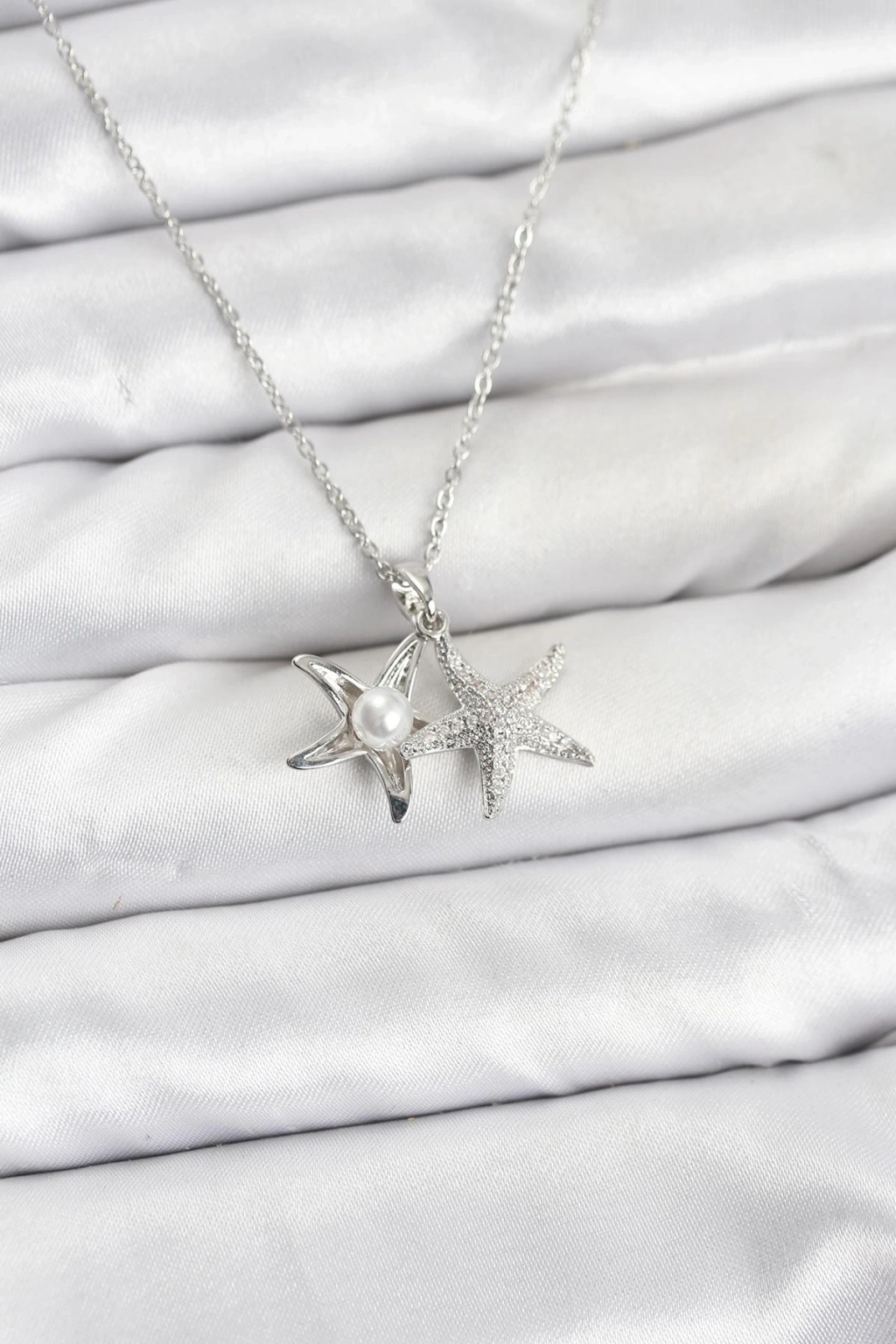 ® 316L Çelik Zincir Gümüş Renk Deniz Yıldızı Model Zirkon Taşlı Kadın Kolye
