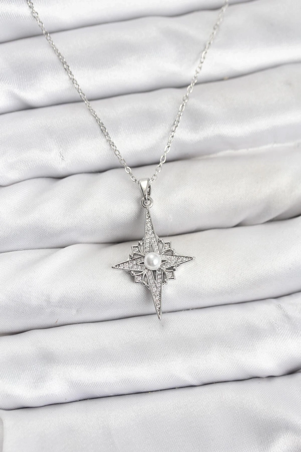 ® 316L Çelik Zincir Gümüş Renk Kutup Yıldızı Model Zirkon Taşlı Kadın Kolye