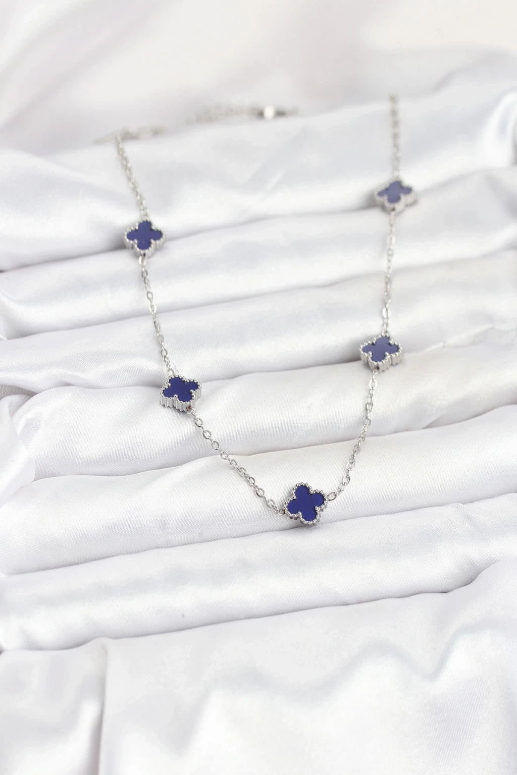 ® 316L Çelik Zincir Gümüş Renk Lacivert Baby Boy Yonca Kadın Kolye