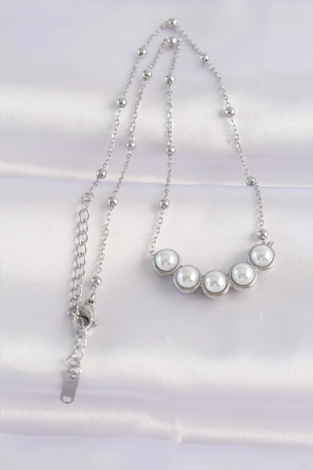 ® 316L Çelik Zincir Gümüş Renk Sıralı İnci Taşlı Kolye