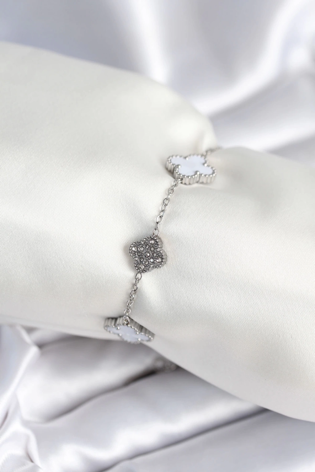 ® 316L Çelik Zincir Gümüş Renk Zirkon Taşlı Yonca Beyaz Kadın Bileklik