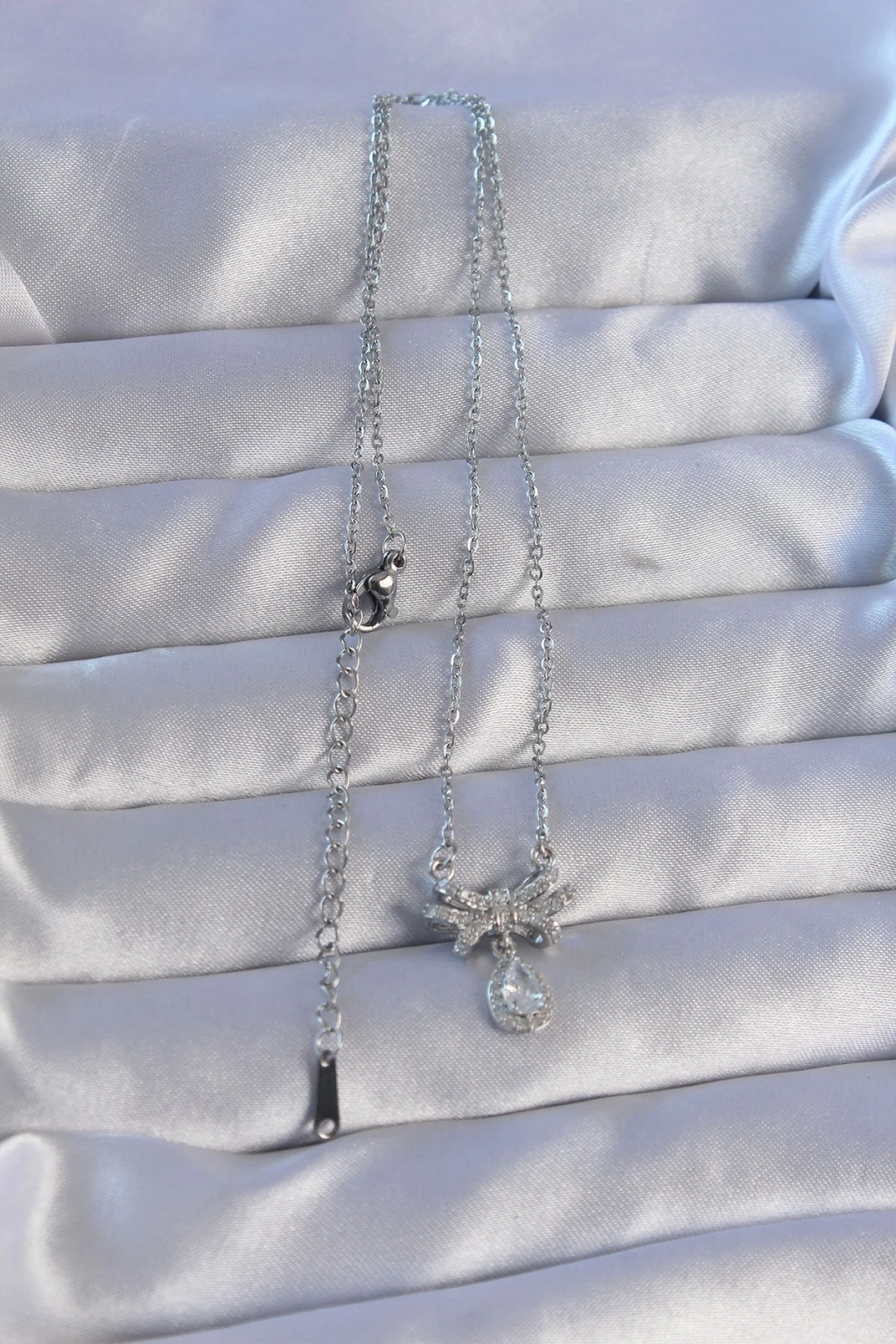 ® 316L Çelik Zincirli Gümüş Renk Zirkon Taşlı Damla Detay Fiyonk Model Kolye