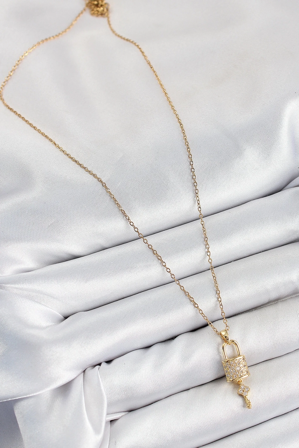 ® 316L Çelik Zirkon Taşlı Kilit Ve Sallantılı Anahtar Model Gold Renk Kadın Kolye