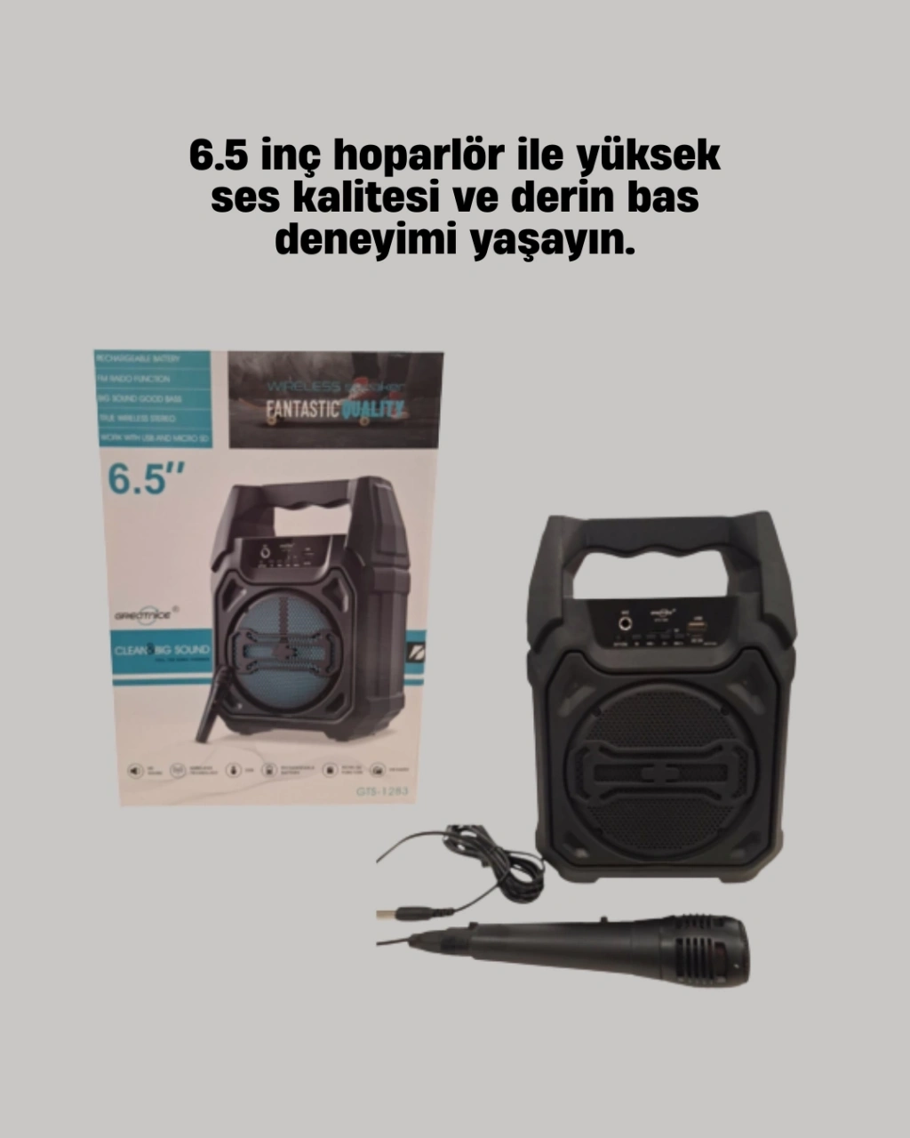 Müzik keyfini her ortamda doyasıya yaşamak için tasarlanan 6.5 inç Bluetooth hoparlör, güçlü performansı ve çok yönlü özellikleriyle fark yaratıyor. 15W çıkış gücü, derin bas ve net tizlerle kaliteli bir ses deneyimi sunarken, 1200mAh kapasiteli şarj edilebilir bataryası uzun süreli kullanım sağlar. Bluetooth teknolojisi sayesinde telefon, tablet veya bilgisayarınıza kolayca bağlanabilir, kablosuz özgürlüğün tadını çıkarabilirsiniz. FM radyo özelliği ile sevdiğiniz yayınları dinleyebilir, USB veya TF kart girişleri sayesinde müzik arşivinizi doğrudan hoparlörden çalabilirsiniz. Ürünle birlikte gelen kablosuz mikrofon, karaoke etkinlikleri, anonslar veya eğlenceli partiler için ekstra avantaj sağlar. Dayanıklı plastik kasa ve şık tasarımı ile hem estetik hem de işlevseldir. Taşınabilir yapısı sayesinde evde, bahçede, piknikte veya açık hava partilerinde kolayca kullanılabilir. Eğlenceyi her an yanınıza taşıyabileceğiniz bu hoparlör, modern yaşamın vazgeçilmez aksesuarlarından biri olacak.