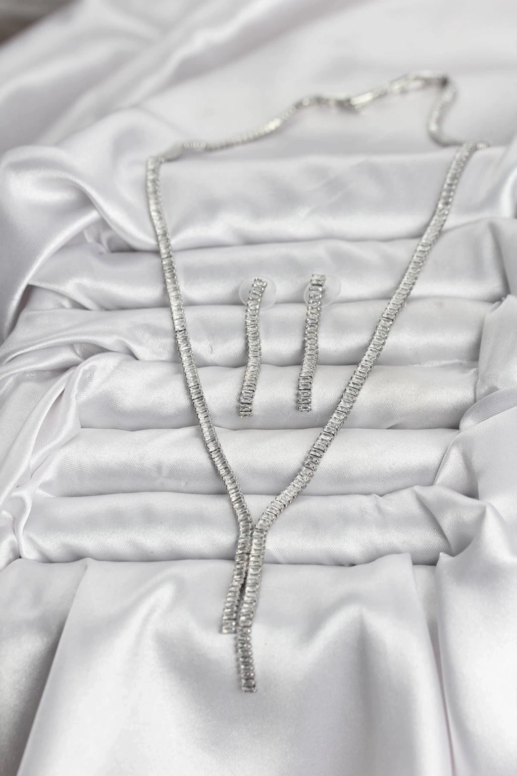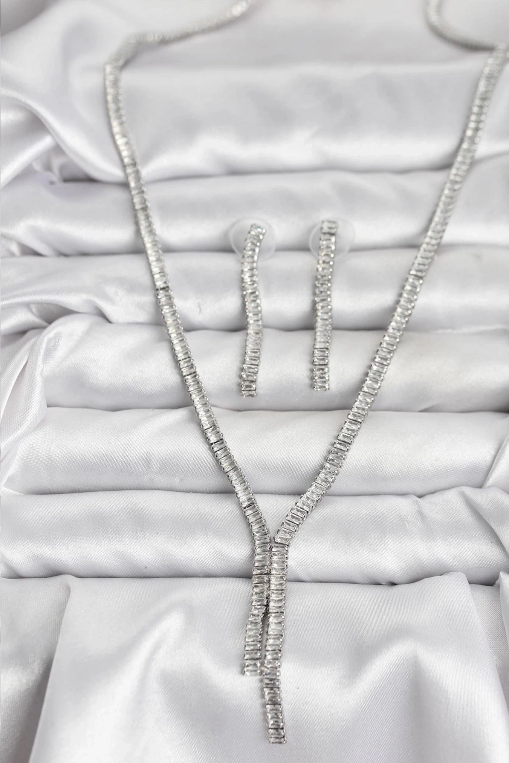 ® Gümüş Renk Baget Zirkon Taşlı Kadın Kolye Küpe Set