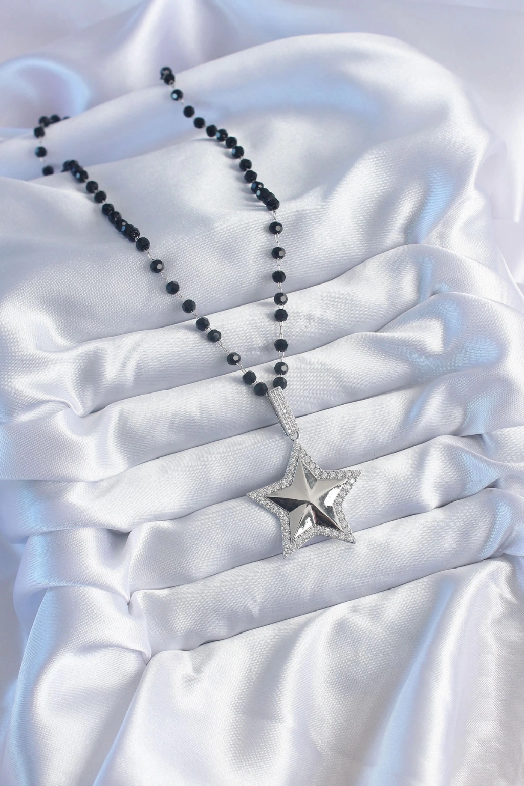 ® Gümüş Renk Siyah Boncuk Zirkon Taşlı Pirinç Yıldız Model VİP Seri Kadın Kolye