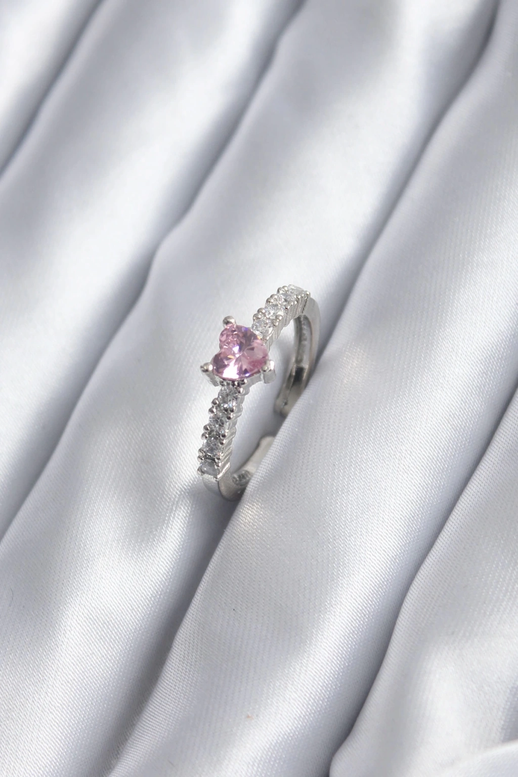 ® Gümüş Renk Zirkon Taşlı Pembe Kristal Kalp Model Kadın Yüzük